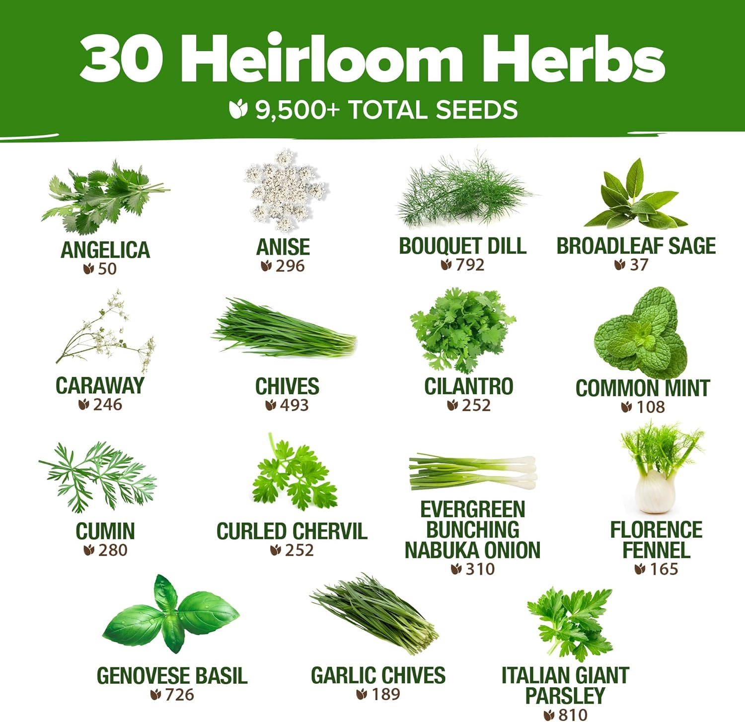 - GROW 30 CULINARY HERBS - Your favorite herb seeds for planting in one convenient pack. Enjoy flavorful herbs like angelica, basil, chives, cilantro, dill, lavender, mint, oregano, parsley, rosemary, sage, and thyme.