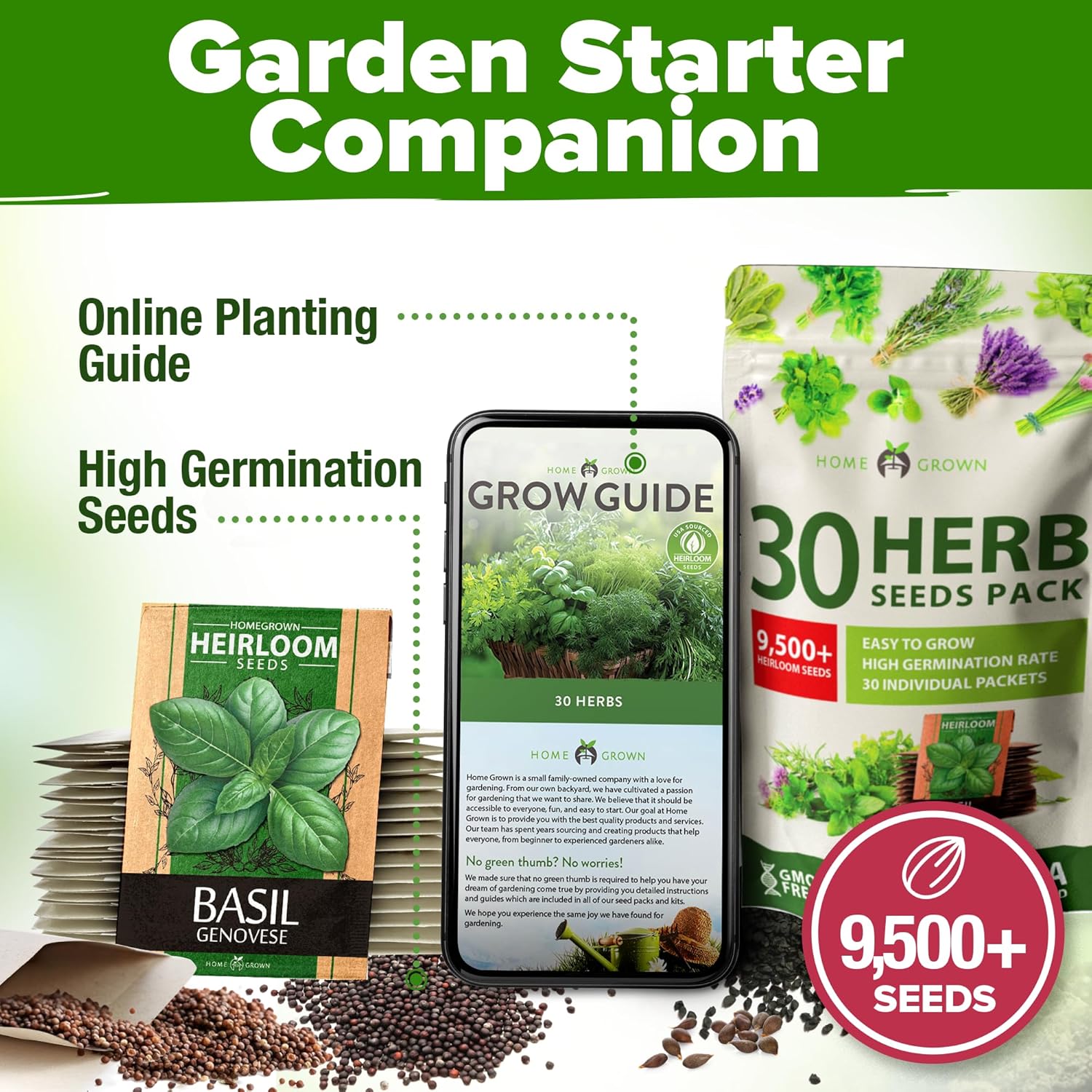 HOME GROWN 30 Herb Seeds for Planting 9,500+ Non-GMO Heirloom Seeds | Extra Large Variety Pack Herb Kit – Indoor Outdoor & Hydroponic | Culinary Seed Set | Grow Your Own Herbs | Gardening Gift