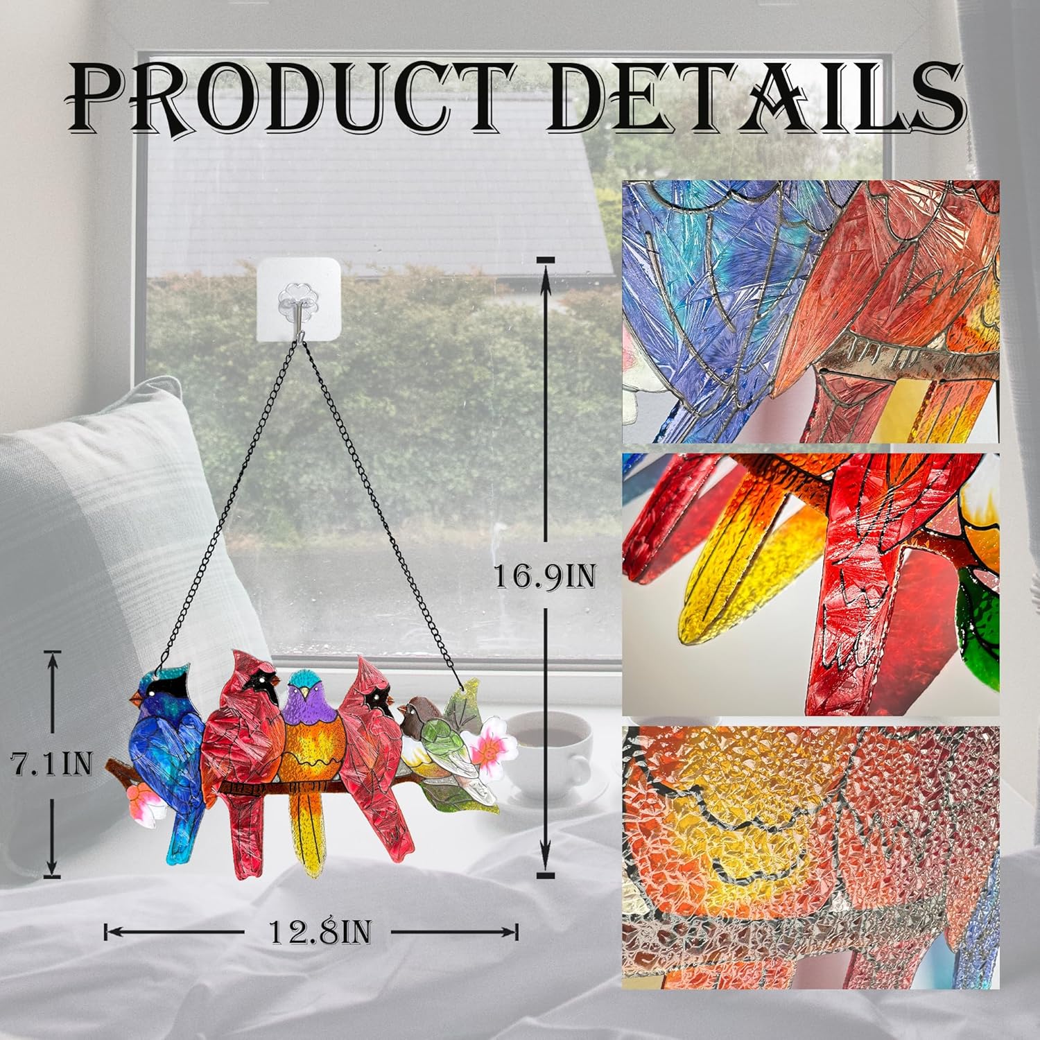 Stained Glass Window Hanging - Large Stained Glass Birds on Branch, Birds Sun Catchers Indoor Window with Chain and Hook Gifts for Bird Lover, Mom, Grandma, Stocking Stuffers for Women