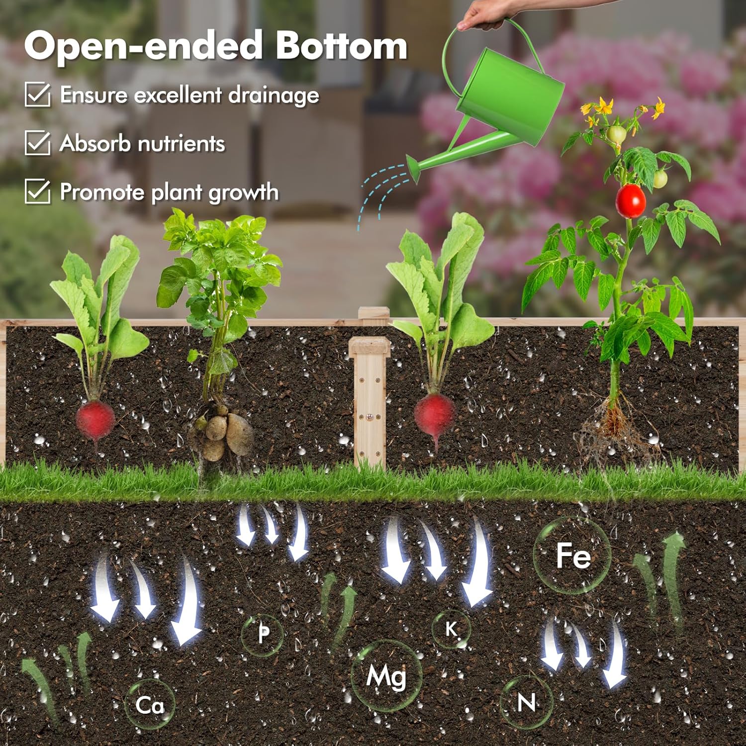 - 【Stable & Easy to Assemble Structure】Constructed from 0.6” thick wood boards and reinforced corners, the outdoor wood planter ensures unparalleled stability and sturdiness. Moreover, the slotted legs facilitate a hassle-free assembly process, allowing you to have your garden bed ready in no time.