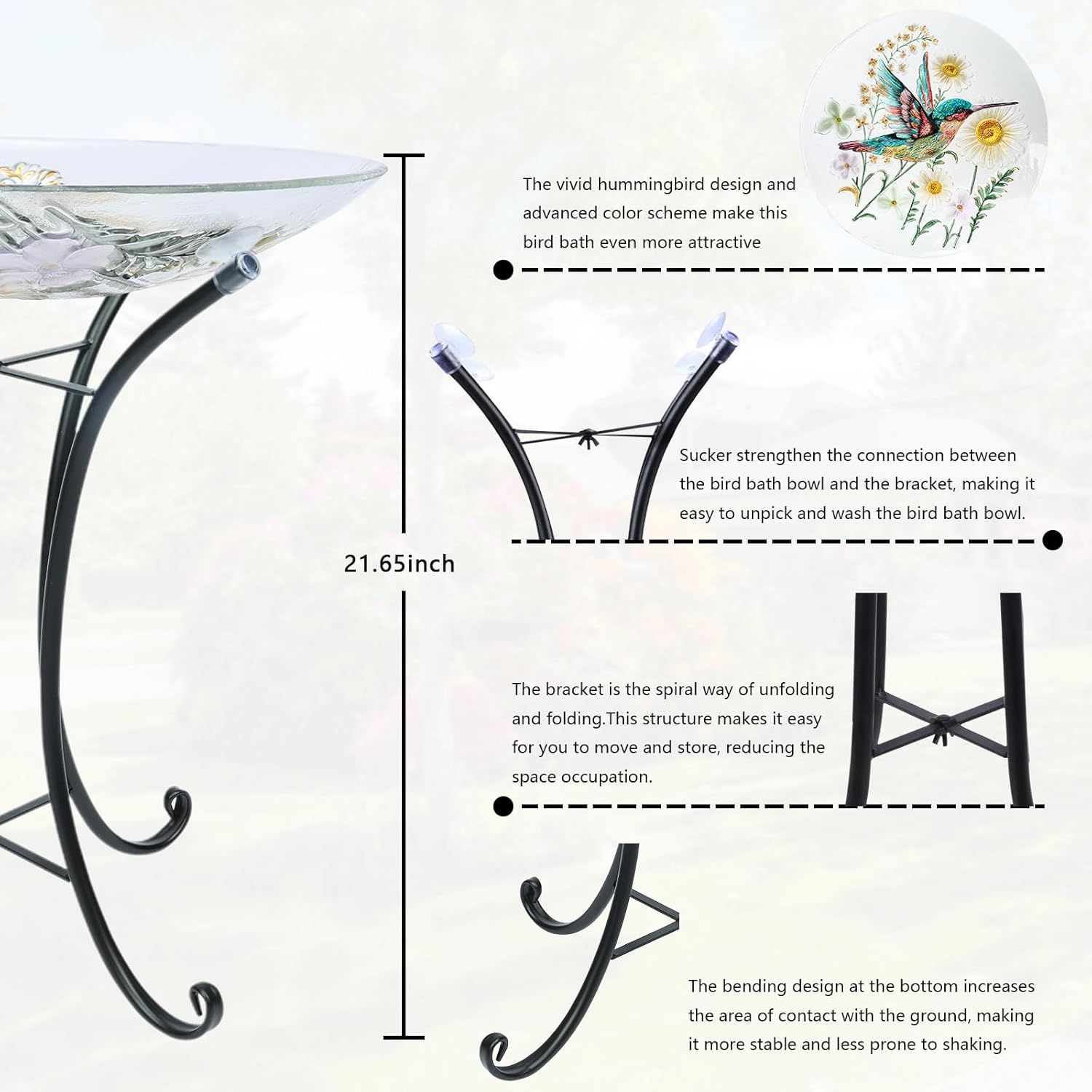 MUMTOP Bird Bath-Bird Baths for Outdoors - Hummingbird Glass Large Bird Bath Bowl with Metal Stand, Bird Feeders for Outside and Garden, Patio,Lawn Decor