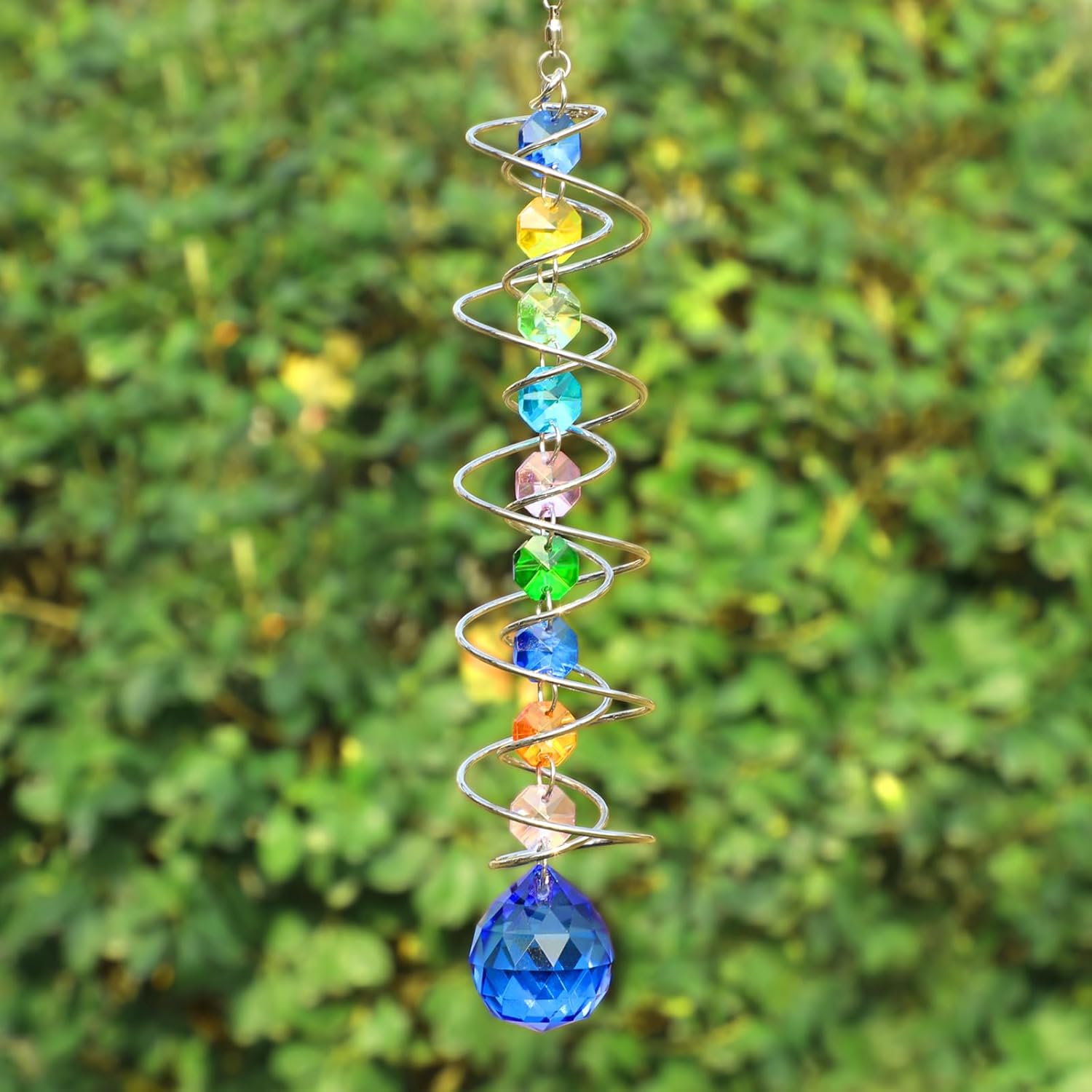 - Sun Catchers: You will get a crystal suncatcher gazing ball, combination of nine colorful octagonal crystals and a large blue crystal ball, when the special double structure spiral tail is rotated, the crystal ball seem to move up and down, make a magical optical illusion!