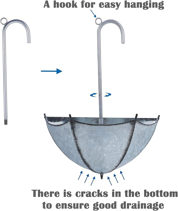 - UNIQUE UMBRELLA DESIGN: Creative shape of inverted umbrella design with long handle, perfect for garden fences, backyard trees, or courtyard railings. There is a hanging hole on the handle and the back of the umbrella is flat, which makes it suitable for mounting on a wall or any flat place. There is some weld cracks in the bottom to ensure good drainage