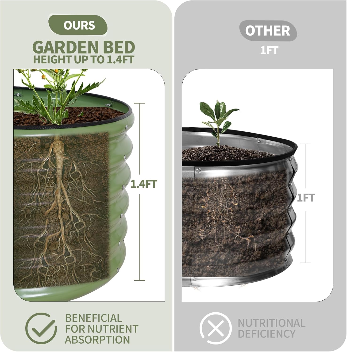 - 【Higher Height】The height of this planter garden bed is 1.4 ft, which is higher than other galvanized planter beds suitable for the growth of deep rooted plants. Higher heights are very knee friendly. When standing, you can easily pick vegetables with your arms.Make your planting life more relaxed and enjoyable