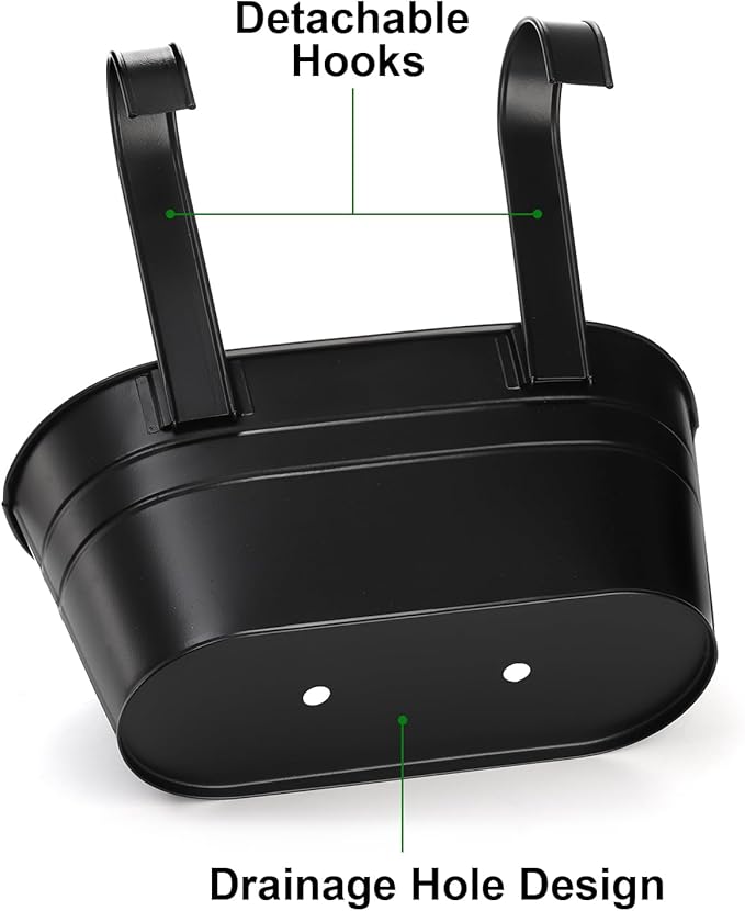 - Balcony Rail Planter Set: Package includes 6 black metal hanging planter pots. Breathable drainage hole at the bottom of the planer prevents water accumulation and keeps the soil drained and ventilated. An excellent choice for your lovely flowers and plants. Great for hanging on the fences, windows, walls, railings, flower stands, anti-theft nets, etc.