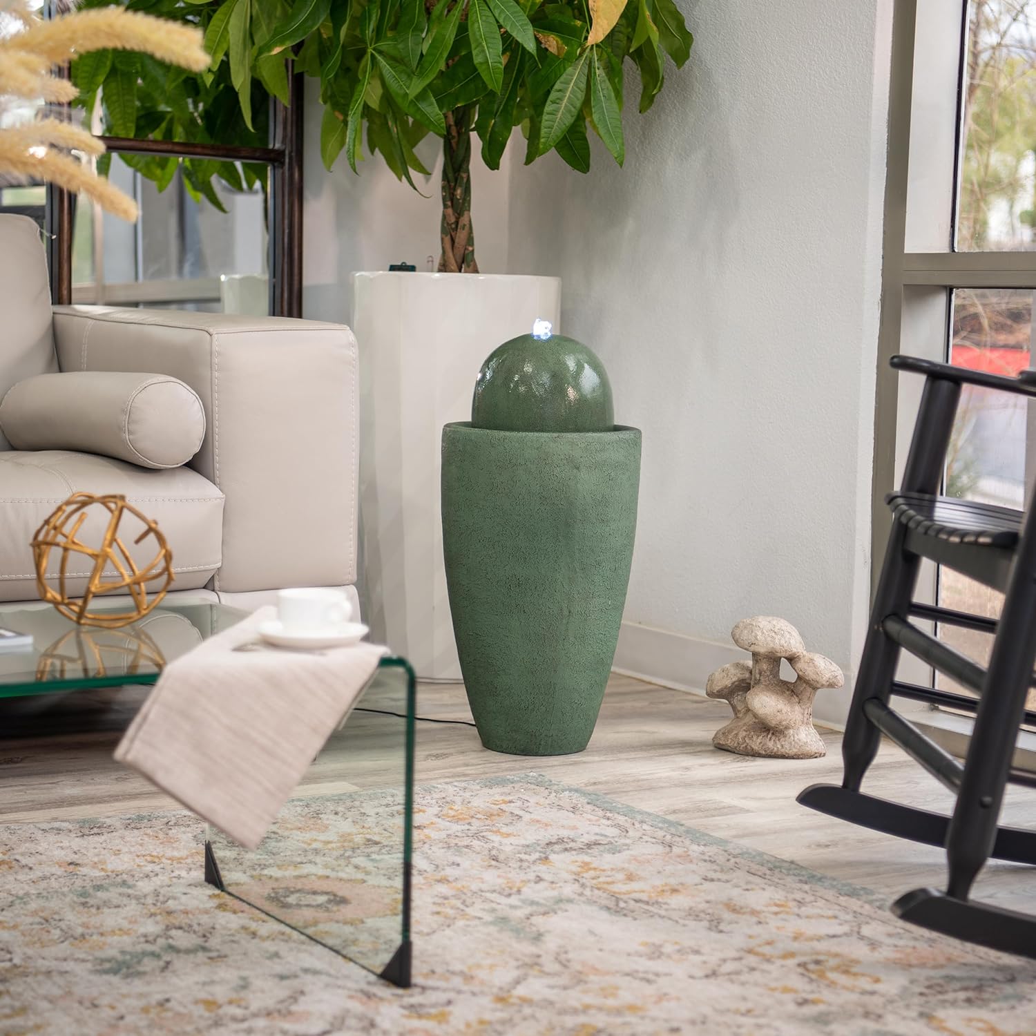 - GREAT SIZED AND LONG-LASTING: This ball water fountain decor measures 25.98"H x 11.81"L x 11.81"W, cord length 5 meters, made of durable Fiber Stone that ensures high quality for years. Also, water capacity of the fountain is 6.4 L.