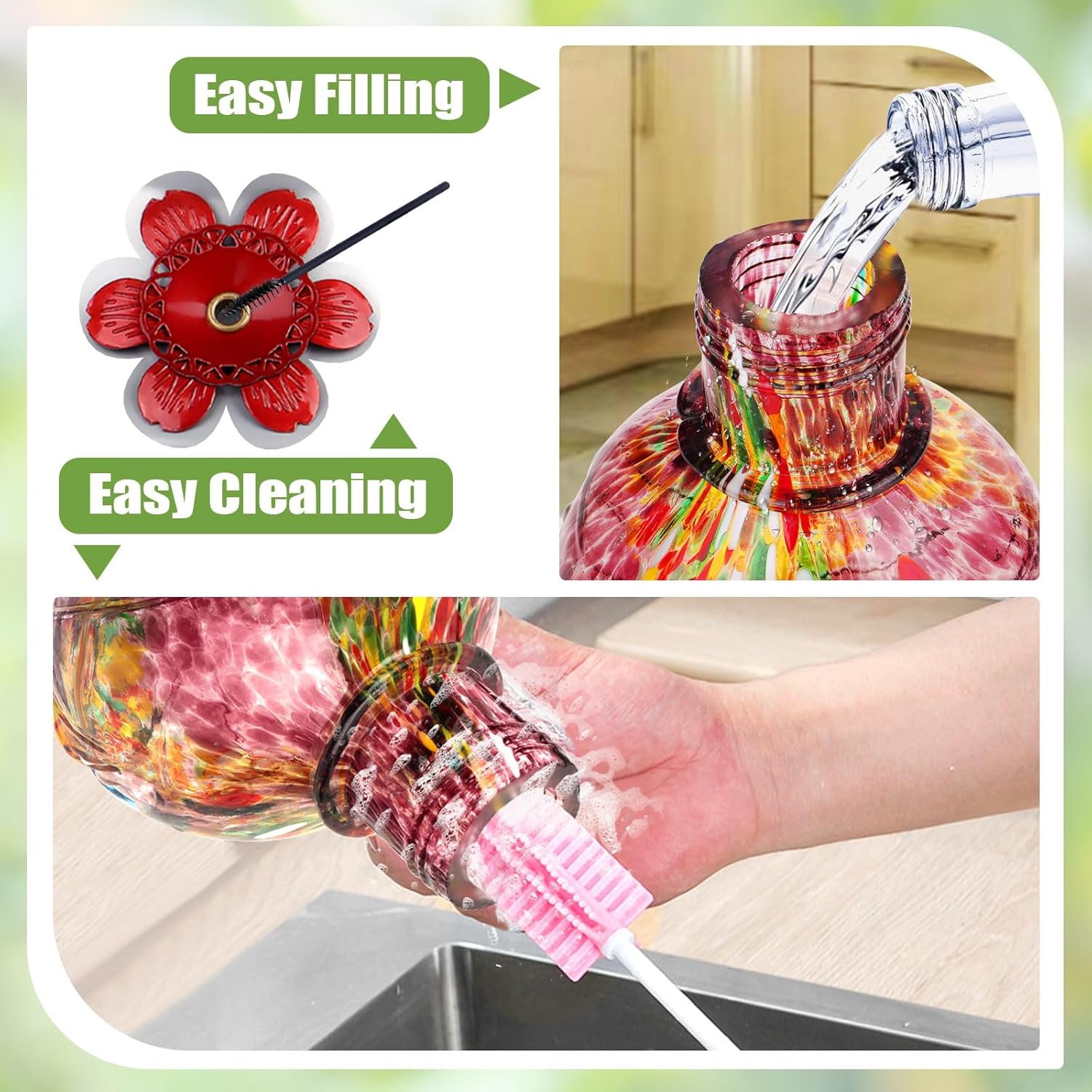 - Hand Blown: Handmade glass feeder is thick, durable, and unique. Bright color attract more hummingbirds to your garden. Equipped with quality ant moat hook for hanging, premium metal cap and plastic base with leak-proof edge, no worries about messy spills
