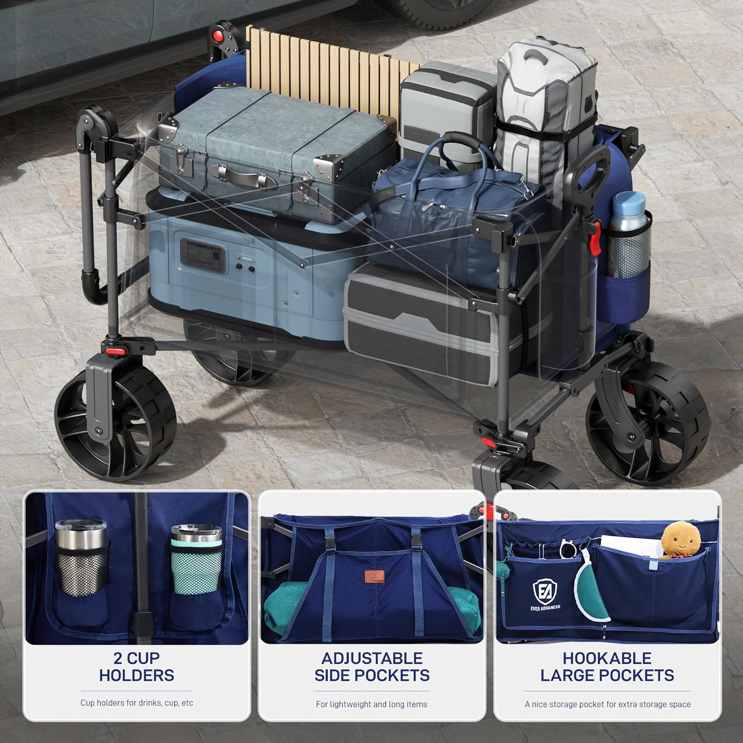- LARGER CAPACITY: This foldable wagon is deeper than regular wagons and measures 42.5" L x 20.9" W x 27.2" H when open. It features 2 cup holders and multiple side pockets to carry more items