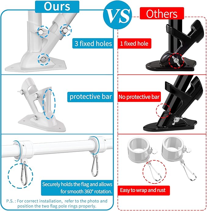 - 🇺🇲Upgraded Bracket and Tangle Free Rings: The high strength aluminum alloy flag pole holder has unique protective bar and 3 fixed holes to make the two-position (90° and 45°) flag pole more stable. The two new designed flag rings and two sturdy carabiners, which could make the flag tangle-free in the wind. And Adjustable length swivel flag pole kit can be installed according to the different size flags.