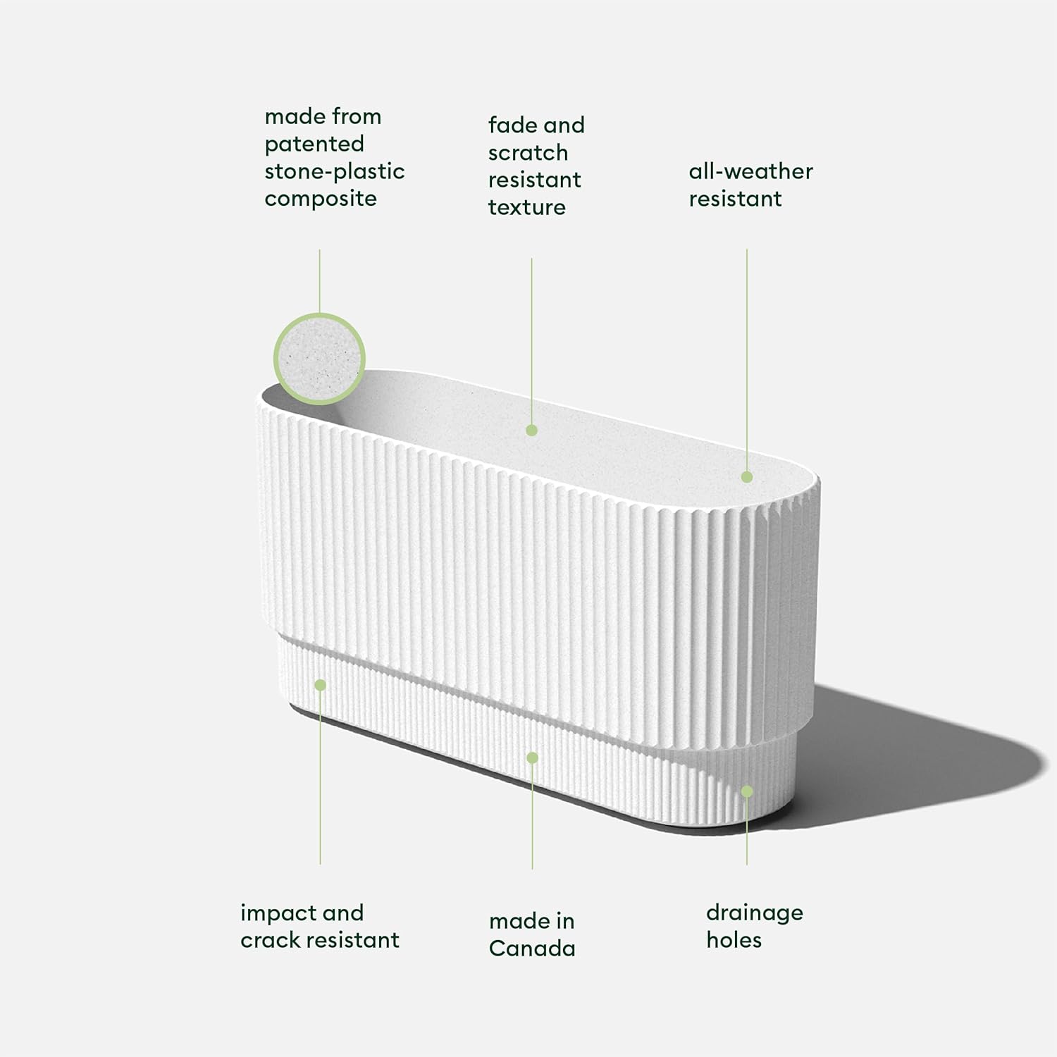 - DURABLE MATERIAL: Made from a patented plastic-stone composite, this fluted planter has a subtle textured finish and is all-weather resistant to cracks, scratches, UV and fading; perfect for hot or cold climates ranging from -20 to +120 degrees