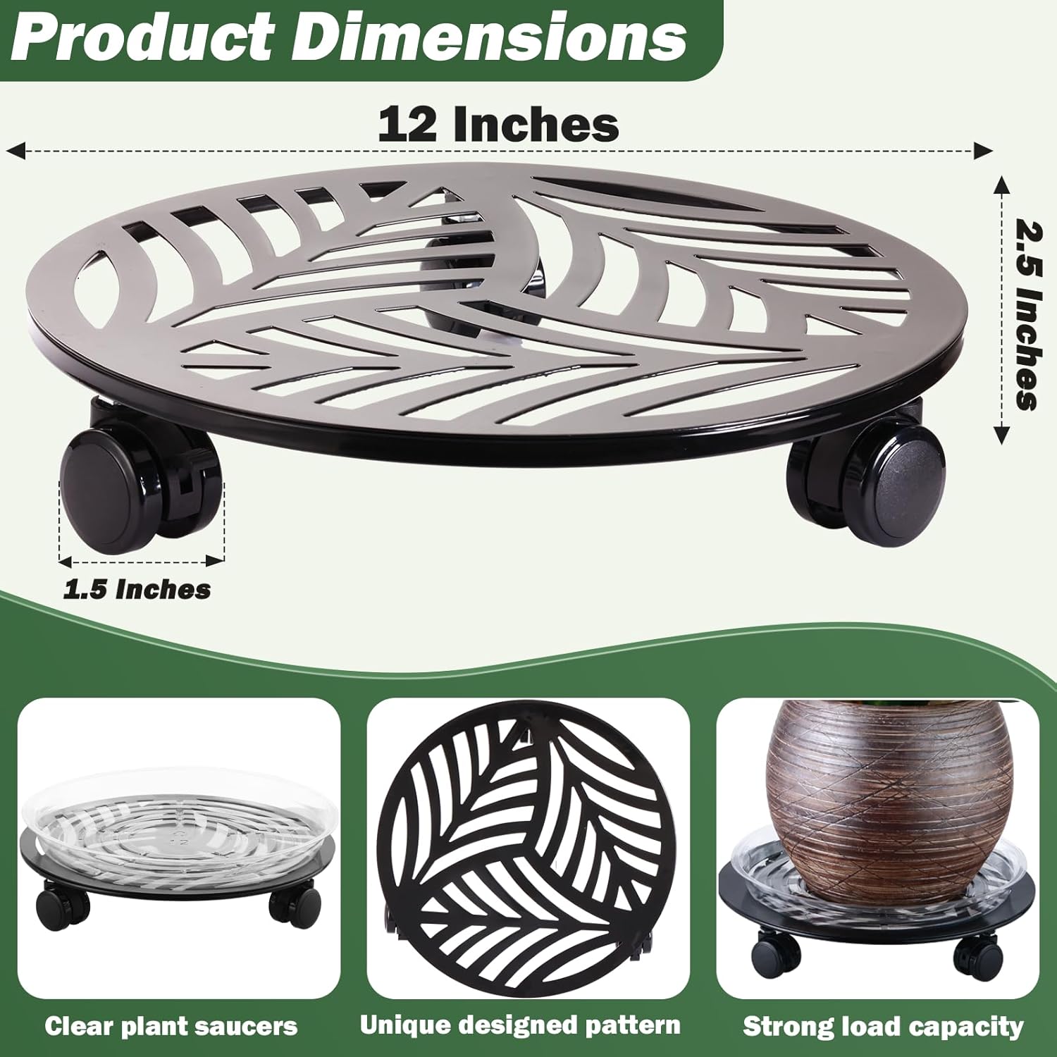 - Unique Leaf Pattern Design: The package will come to you with 3 packs of 12” large PU wheeled metal plant caddy, 3 packs of 10" clear plant saucers and a wrench, which the metal plant caddy is self-designed unique leaf pattern.