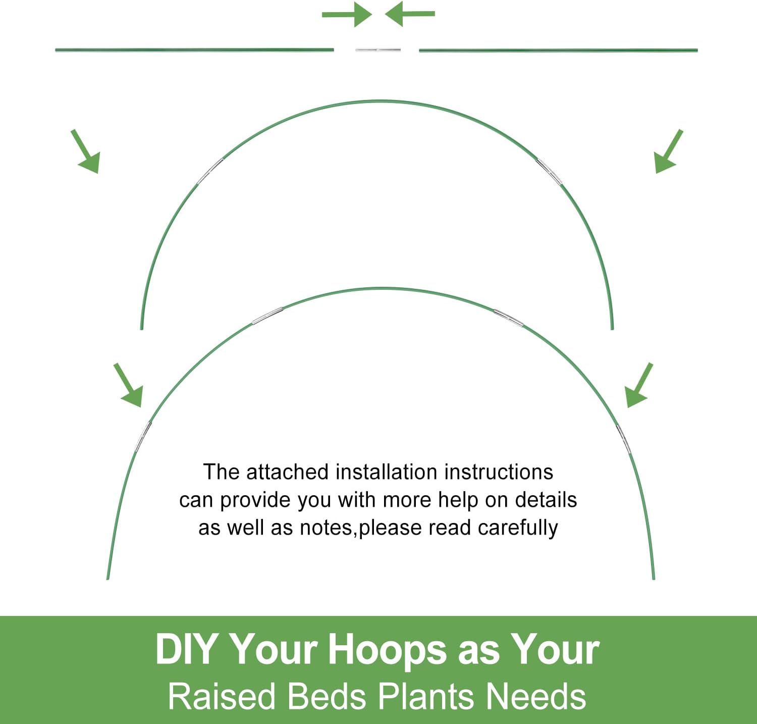 - 🌱【Garden hoops for Raised Bed】: Greenhouse Hoops frame is the best choice for raised flower beds, vegetable gardens, patios. The manual DIY garden hoops grow tunnel kit can be matched with different types of covers to provide adequate protection for your plant seedlings, flowers, tomatoes and other garden plants in any season.
