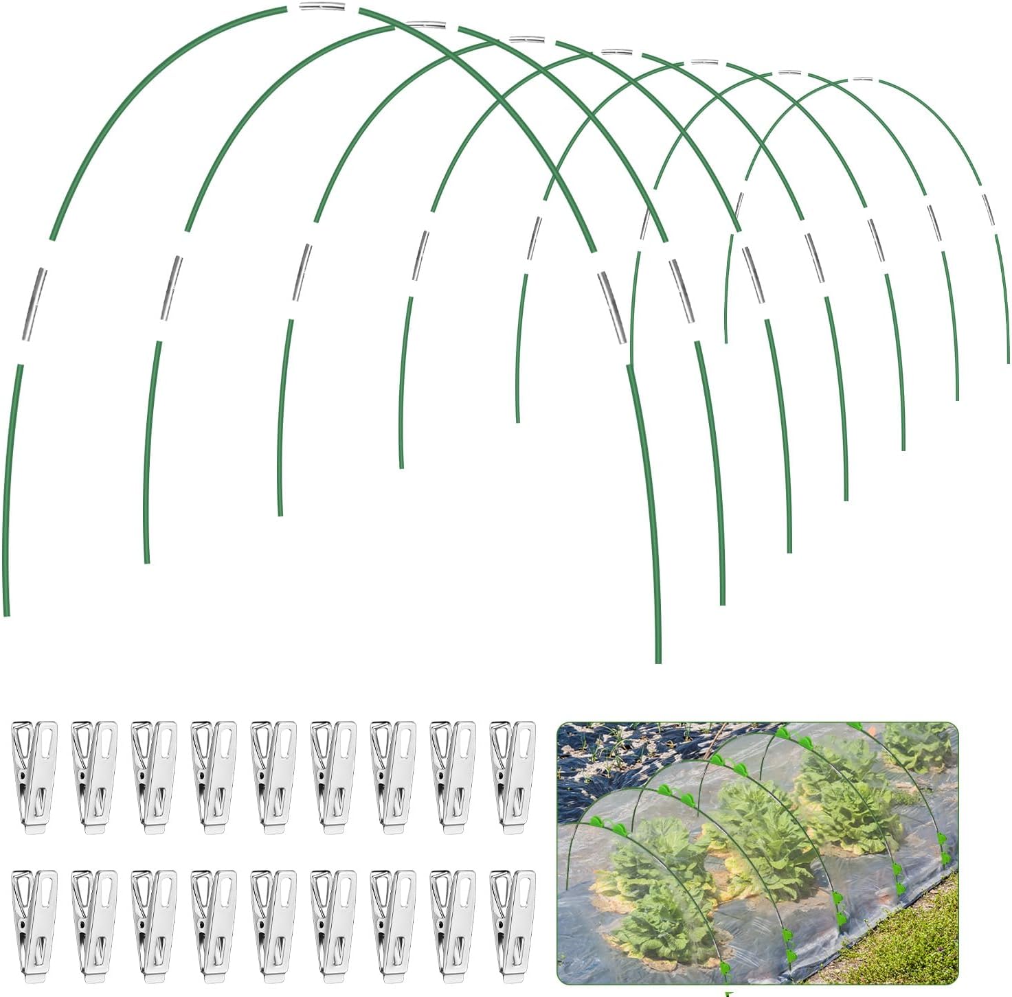 - 🌱【Garden hoops DIY kit Includes】: 30 Pcs 5mm diameter garden bed hoops, 17" long, suitable for raised garden beds 2.5'-4.5" or wider, 24 Pcs connectors and 24 Pcs garden clips. You can manually DIY garden planting tunnels of different sizes according to your raised garden bed.