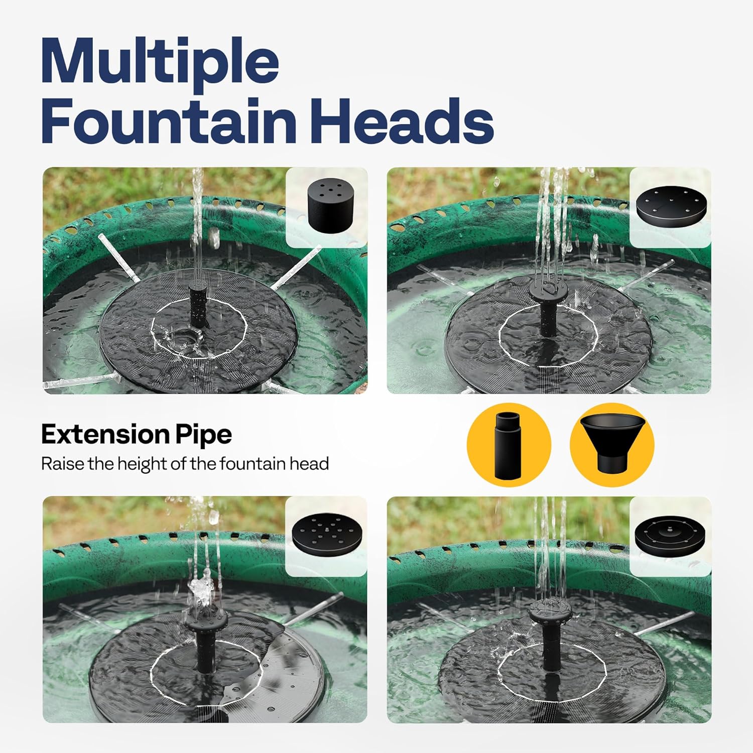 - MULTIPLE WATER PATTERNS: The 6.3-inch diameter VIVOHOME solar-powered fountain pump requires no battery or additional power supply and works better with more sunlight; It activates within three seconds when exposed to sufficient sunlight and automatically shuts off when no water is in the basin; The combo has four nozzles that can be changed to create different spray shapes and heights from 3.9 to 19.7 in; The recirculating water spray can last three to five days, eliminating the need for frequent water addition