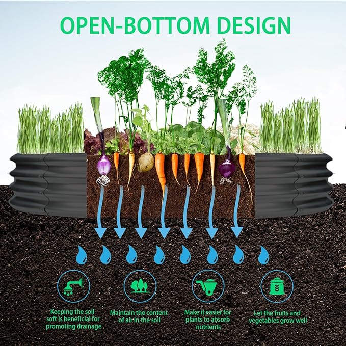 - 【OPEN BOTTOM】: This galvanized raised garden beds have open bottom design,which promotes healthy drainage and allows for deeper root growth, ensuring your plants thrive