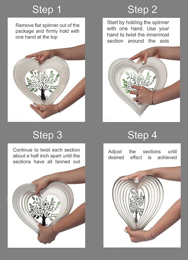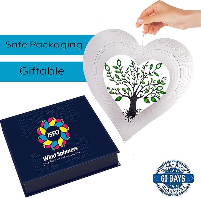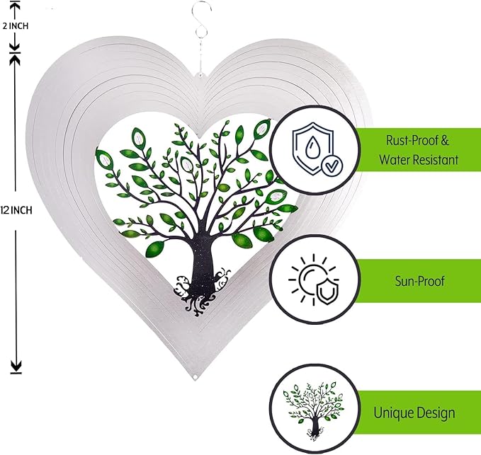 - Enchanting design: This outdoor wind spinner showcases a crystal tree of life enveloped by leaf motifs, with heart-shaped layers that dance in the breeze, creating a mesmerizing spectacle. Elevate your garden's allure with this captivating piece!