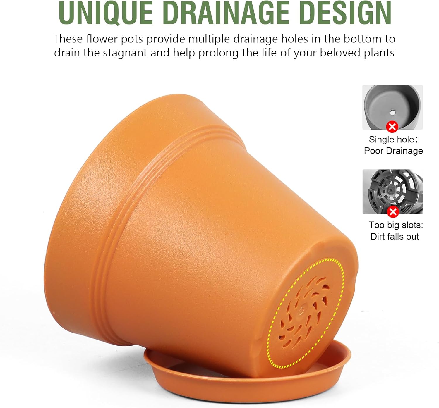 - 【Drainage Holes and Trays】Each plant pot features well-designed drainage holes at the bottom to ensure proper water flow. Additionally, saucers catch excess water, keeping your growing area clean and tidy while also ensuring that your plants remain hydrated without becoming waterlogged.