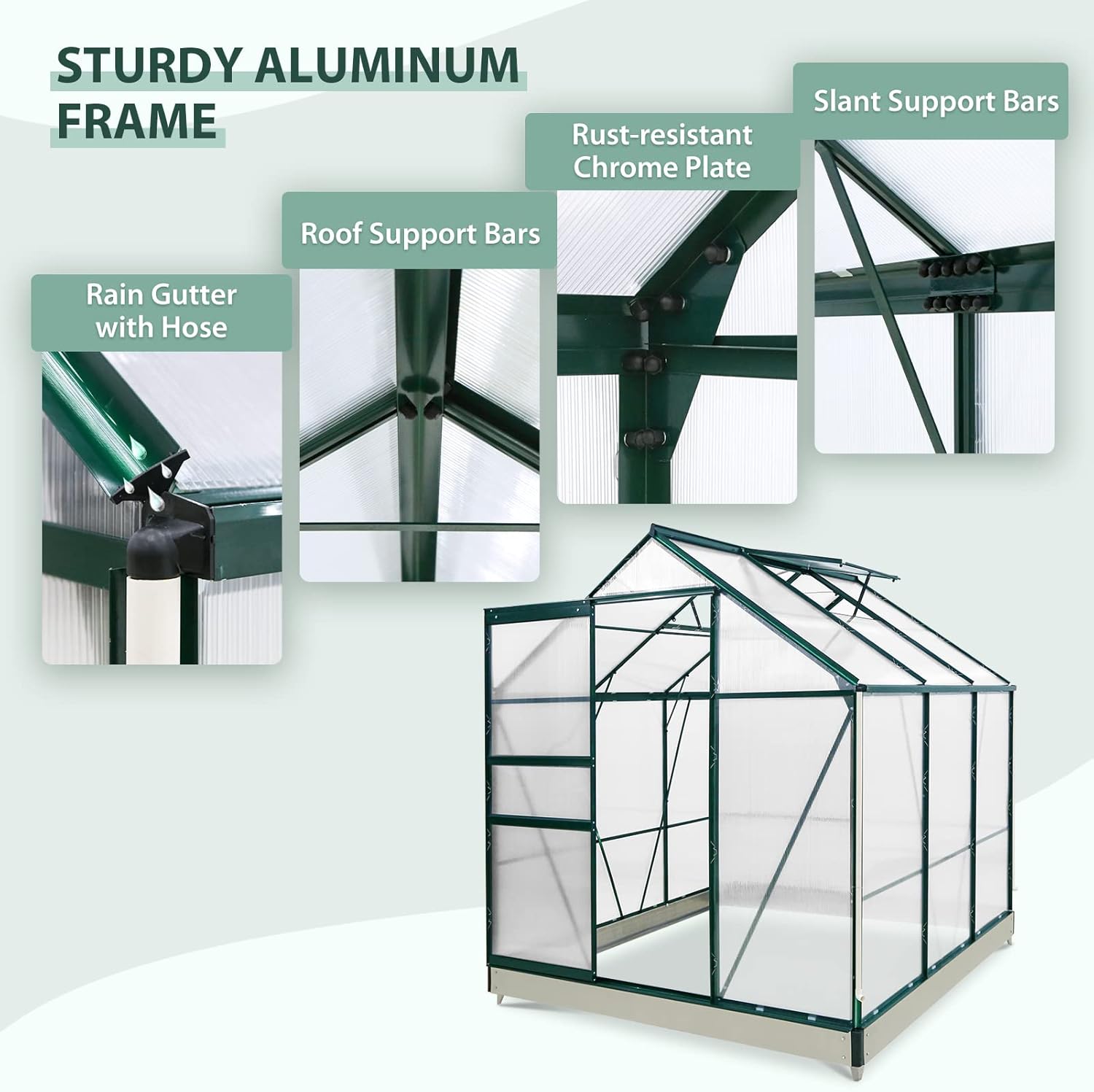 EAGLE PEAK 6x6x7 Outdoor Walk-in Hobby Greenhouse with Adjustable Roof Vent, Rain Gutter, Base and Anchor, Polycarbonate Aluminum Green House for Backyard Garden, Dark Green