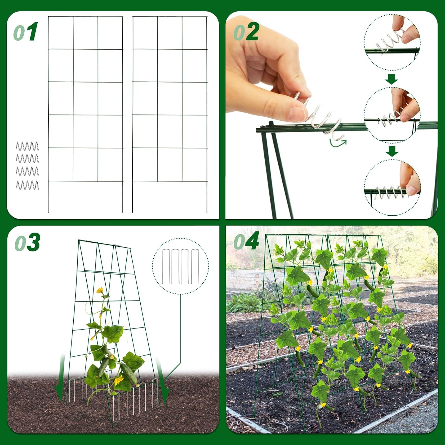 - [Easy to Use]--Simply unfold the cucumber frame, insert it into the soil, and combine multiple garden cucumber frames together using spring connectors to form a stable triangular structure. U-Takes can also be used to increase stability. It is also very easy to store during unused seasons.