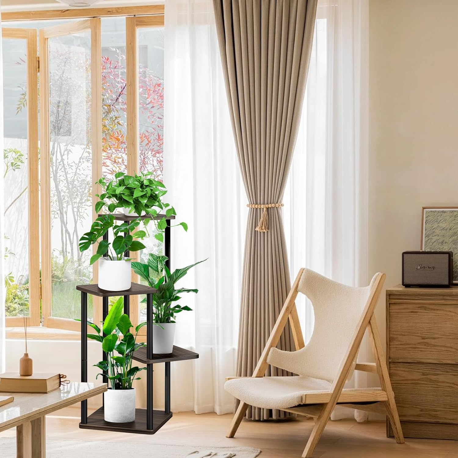 4 Tier Wood Tall Plant Stand Metal Rack Indoor, Multiple Flower Pot Holder Shelves Corner Rack, Planter Shelf Display Rack Storage Organizer for Patio Living Room Balcony Garden(Black Oak)