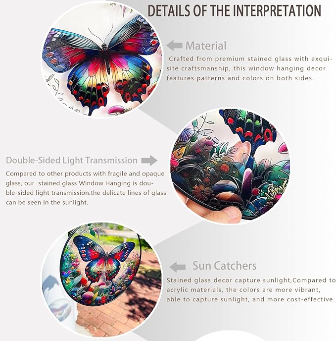 - Hand Crafted Artistry in Butterfly Stained Glass: The butterfly stained glass window hanging features delicate hand-painting, distinguishing it from regular stained glass. The intricate pattern on the front is crisp and clear, showcasing the exquisite traditional craftsmanship while adding immense charm to the glass