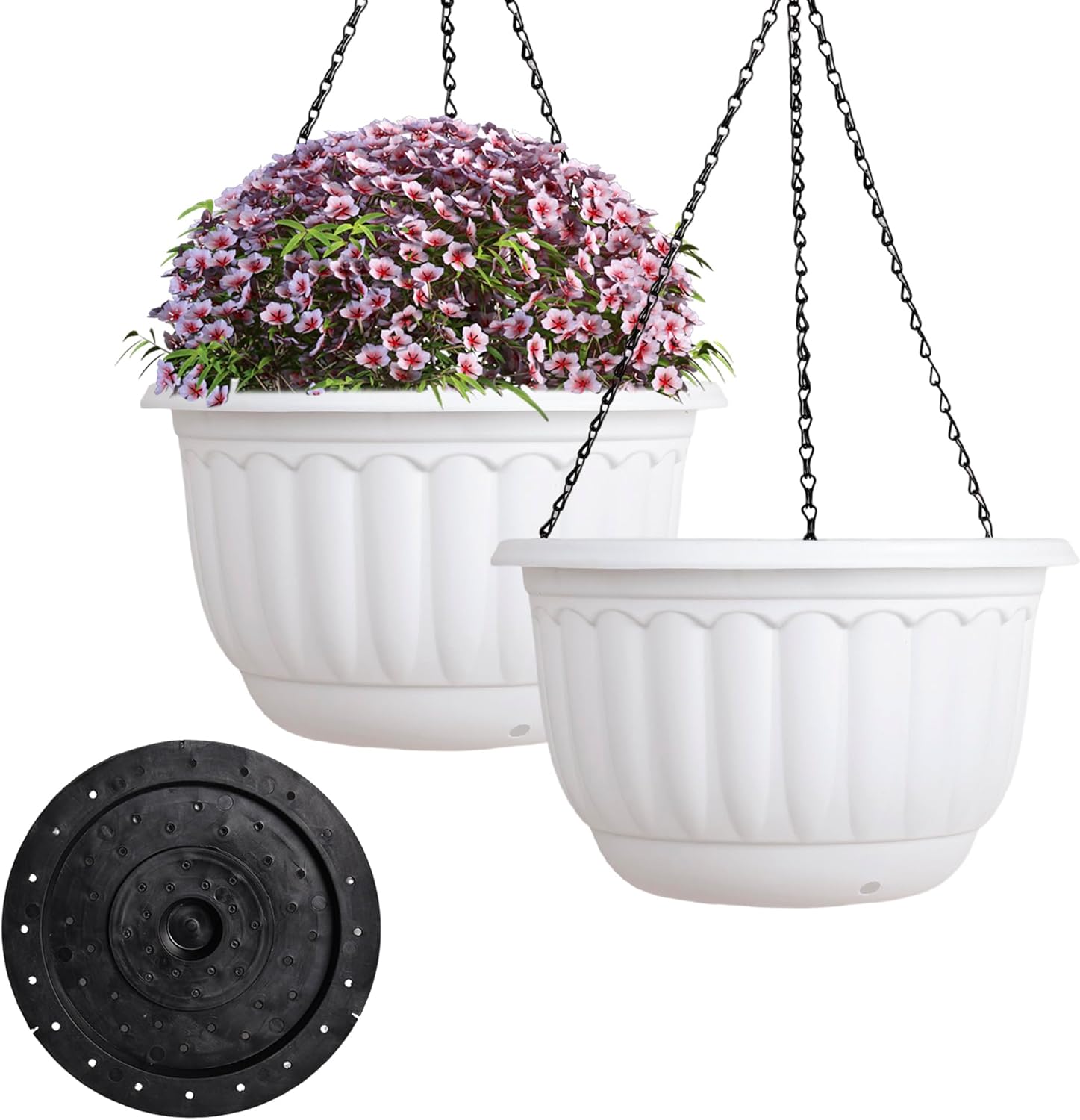 YIKUSH Planters for Outdoor Plants 2 Pack White Plant Pots with Drainage Hole and Absorbing Tray Hanging Planters for Indoor Plants (12 inch, 3 Hooks)
