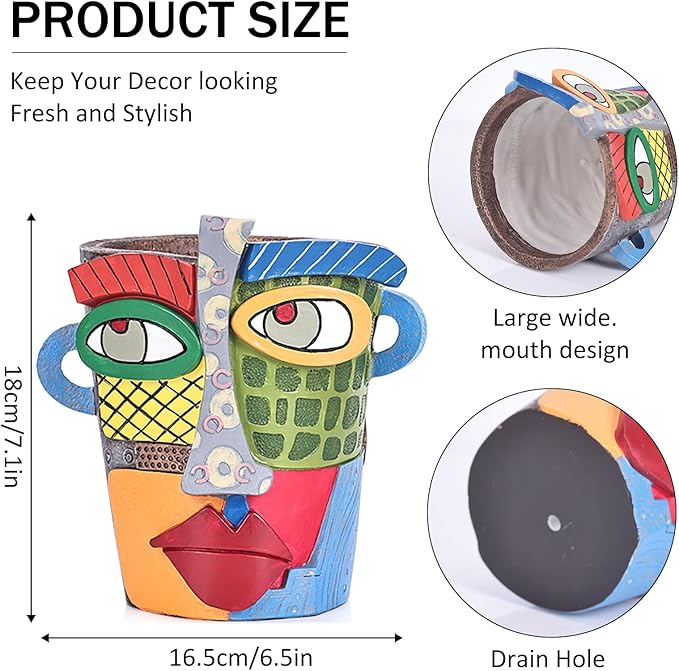 - Abstract and Unique Design: This funky plant pot is made from high-quality resin, featuring an abstract and colorful face design that is sure to catch the eye. Its unique appearance makes it a standout piece among face planters and head planters, perfect for those who love eclectic flower arrangements and vibrant decor. The design brings a playful and artistic touch to any setting, whether indoor or outdoor.