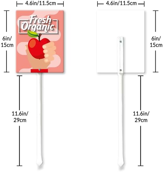 - [Extra large size] The plant tags total height 17.6", Width 4.6“ , Thickness is 0.07". The extra large size of the label makes the graphics are easy to read and attractive. Ther are thick, tall, and sturdy, and go into the ground easily