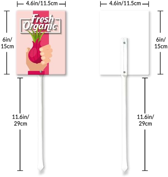- [Extra large size] The plant tags total height 17.6", Width 4.6“ , Thickness is 0.07". The extra large size of the label makes the graphics are easy to read and attractive. Ther are thick, tall, and sturdy, and go into the ground easily