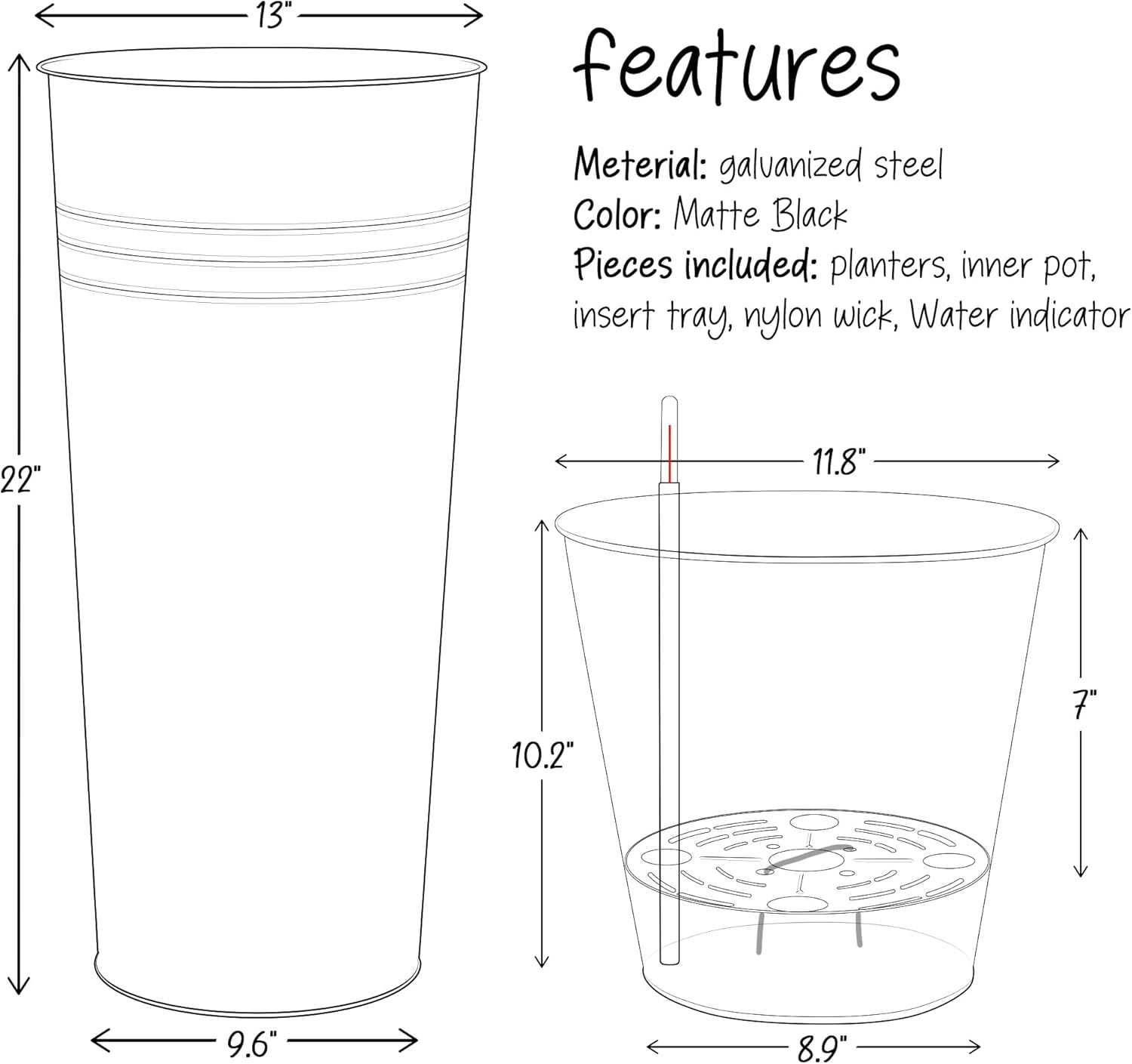KOL 22''H 2-Pack Planter with Water Level Indicator - Galvanized Steel Pot - Self Watering Planters Flower Pot for Plant - Inner Pot Design - Round Metal Planter Box - Indoor Outdoor Planting - Black