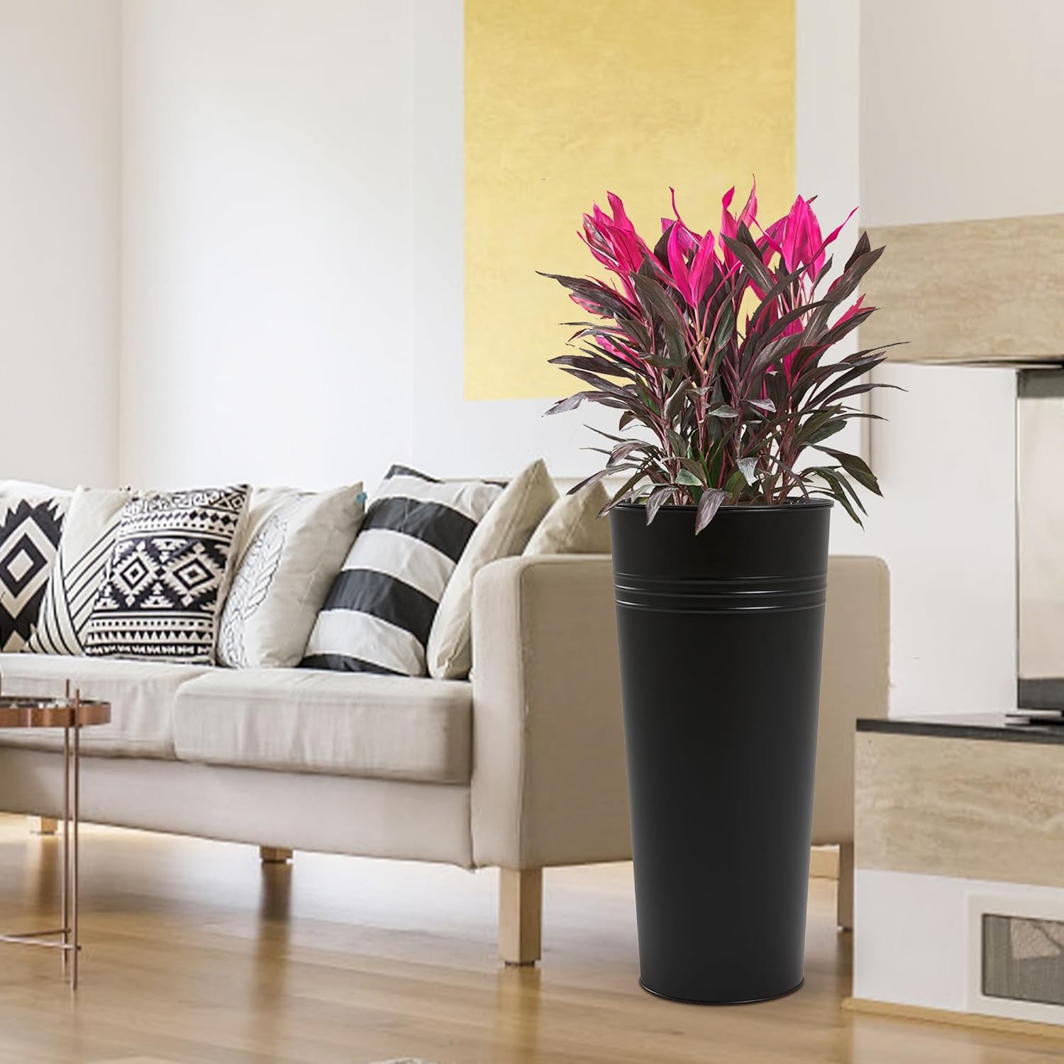 KOL 28'' Tall Galvanized Steel Planter Pot - Flower Pot with Water Level Indicator for Plants - 2-Pack Self Watering Planters - Round Black Powder Metal Planter Box - Indoor Outdoor Grande Plant