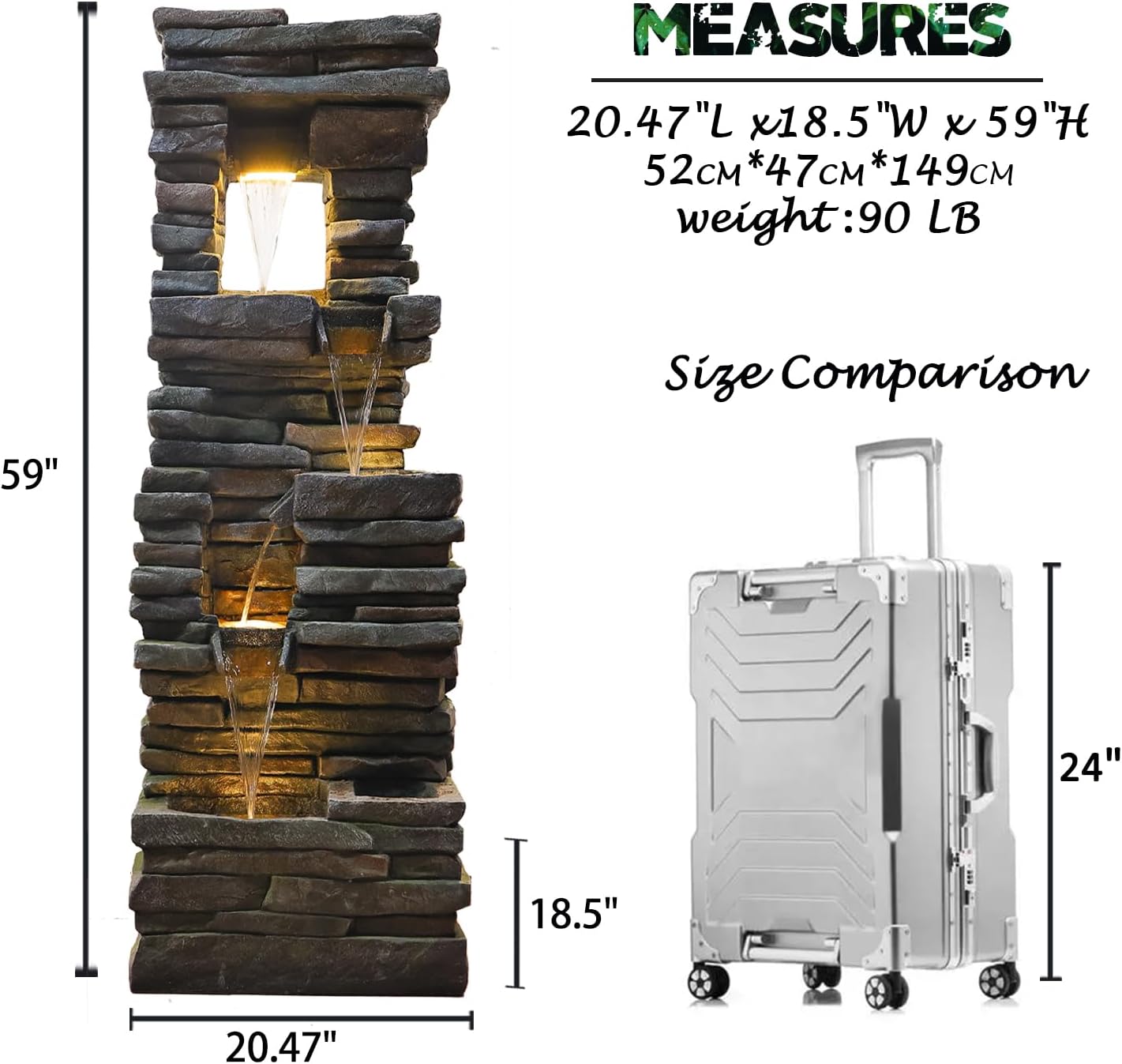 59 inches Outdoor Water Fountain Waterfall — Large Garden Rock Fountains 4-Tiered Waterfall Outdoor with Lights, Natural Stone Look Hollow Fountain for Patio Pool Porch Backyard, Stone Gray