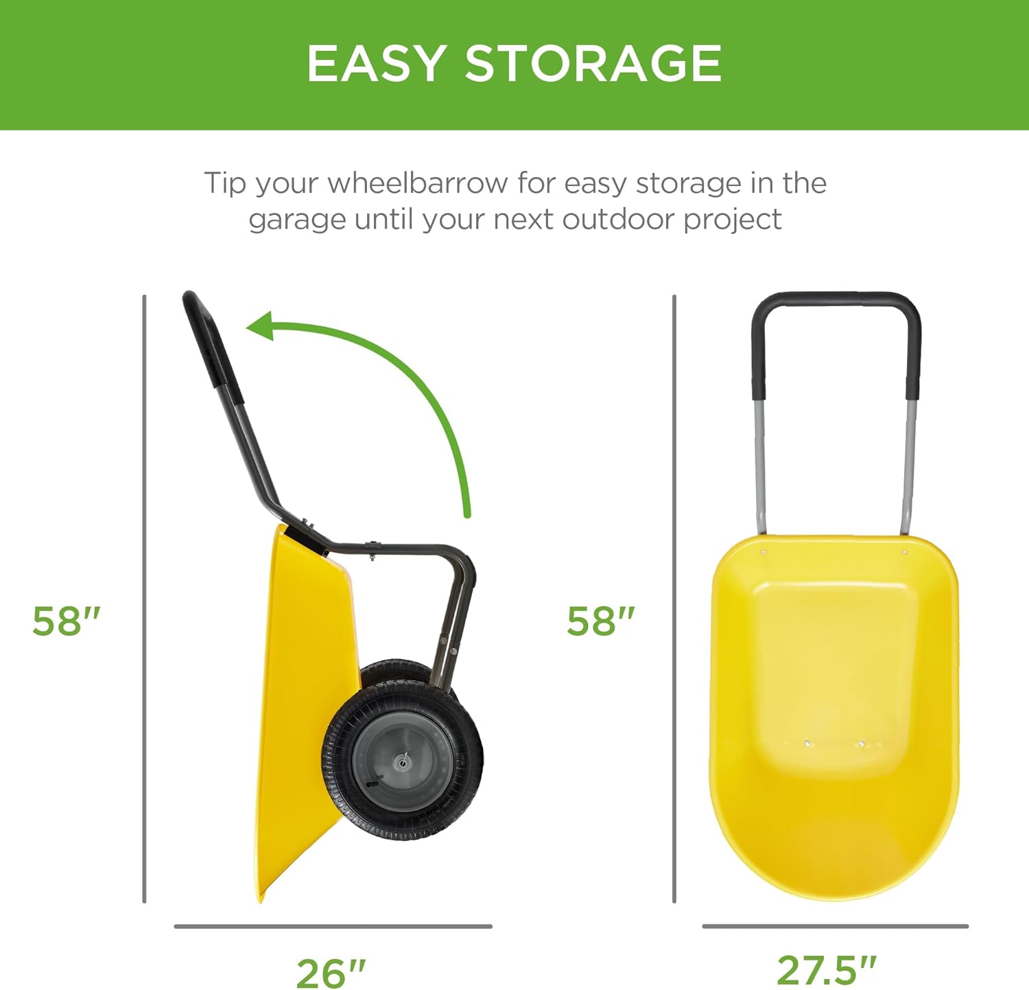 - EASY STORAGE: A compact profile combined with easy tipping action allows you to seamlessly store this wheelbarrow upright in your garage or garden shed; OVERALL DIMENSIONS: 58"(L) x 27.5"(W) x 26"(H); Weight Capacity: 330 lbs.