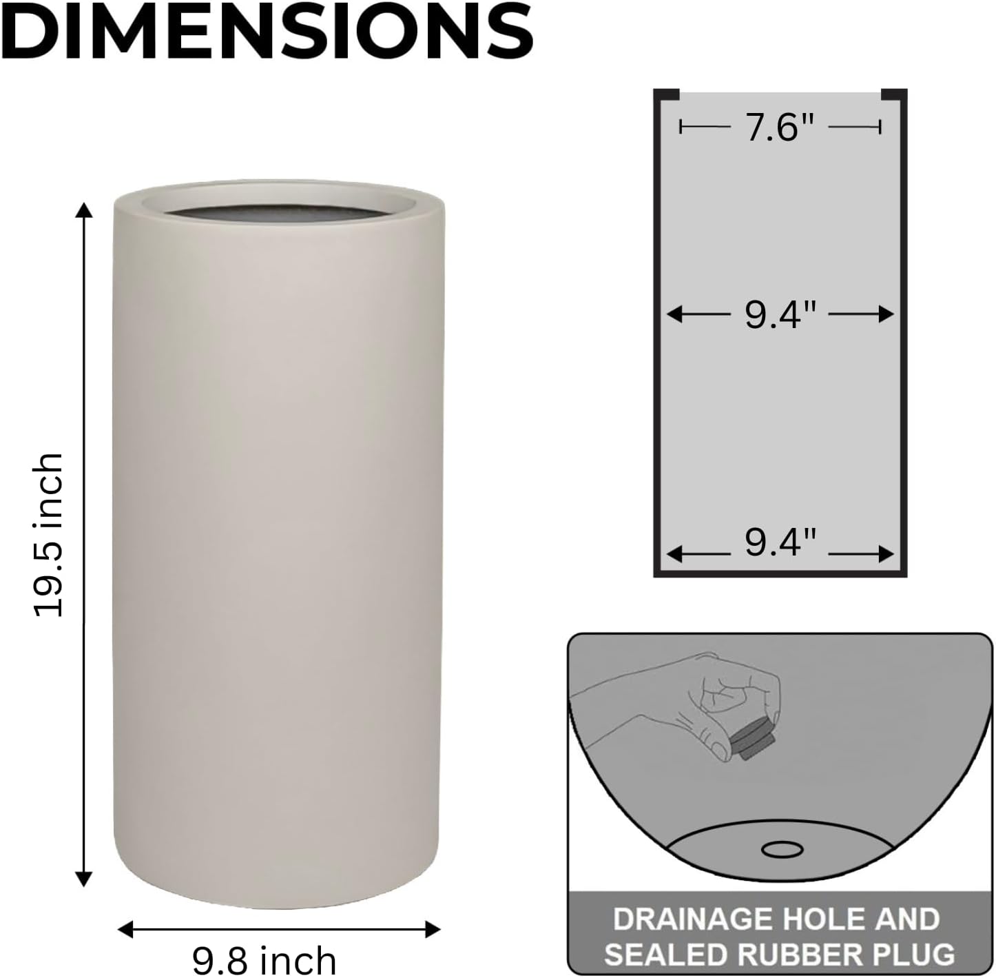 19.5"H x 9.8"D Tubo Fiberstone Cylinder Tall Planter with Drainage Hole, Smooth Finishes, Weather Resistant for Indoor and Outdoor Use, Included 2 Extra Coco Mats (Taupe, 8.2" Pot Opening)