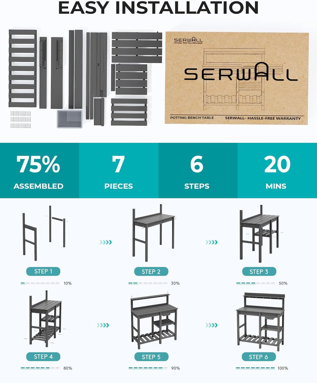 - Easy Assembly: The SERWALL potting bench with storage is easy to assemble. It comes with all the necessary tools and hardware. By following the step-by-step instructions, you can assemble this planting table within 20 minutes.