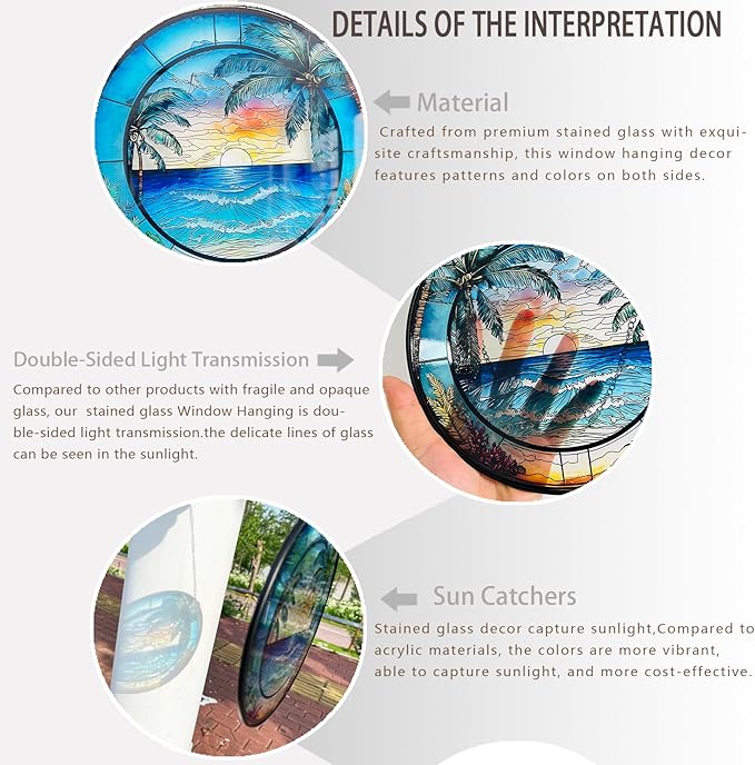 RIVEENY Blue Ocean Sunset Glass Window Hanging Decor,8" Stained Glass Sun Catcher Hanging Decoration with Metal Chain-Sun Catchers for Window Decor Outdoor Garden Decor Gift (Oceans)