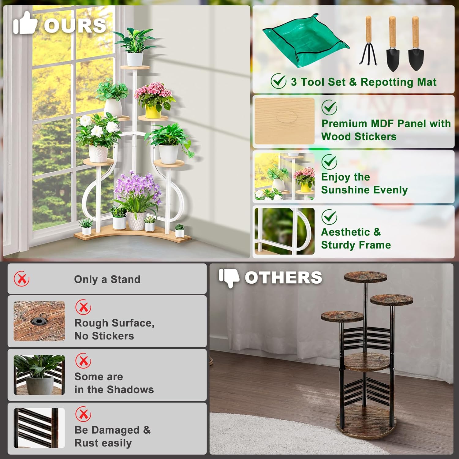- 【Exquisite Details】Our tall plant stand comes with three gardening tools and a repotting mat that plays a role when transplanting plants. In addition, our package also contains matched wood stickers to cover the screw holes.