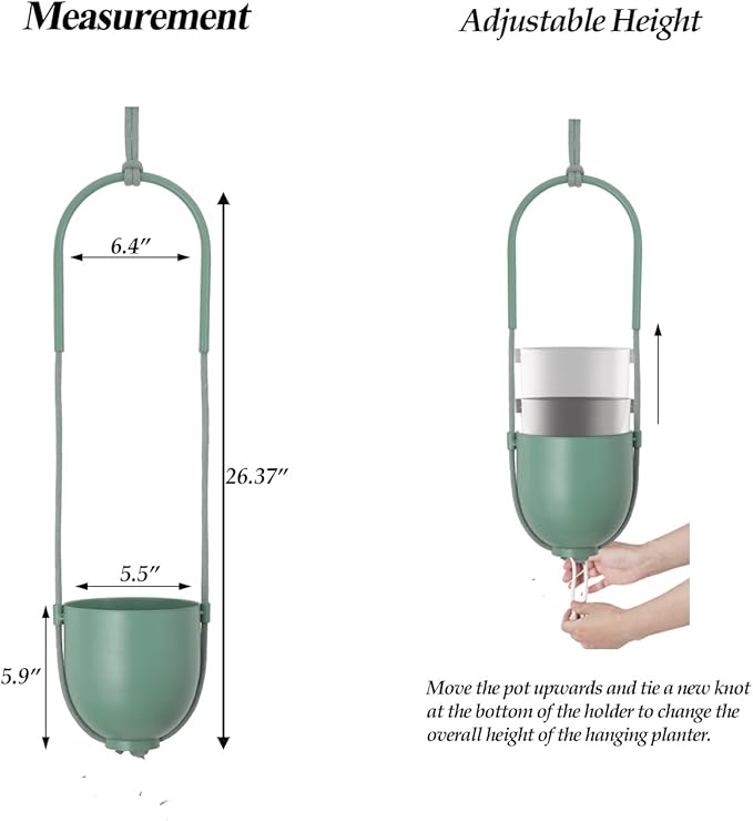 - Material: The plant hanger with pot is made of iron and solid cotton rope, the pot and handle are sprayed at high temperature with matte green pigment, which is durable and rust-resistant. Light weight (No drainage hole)