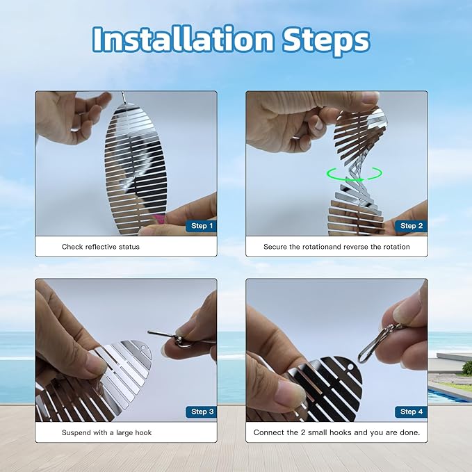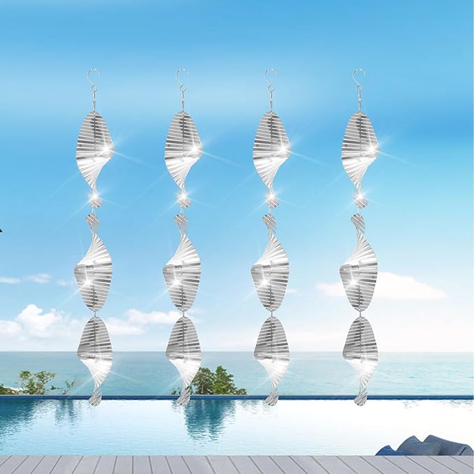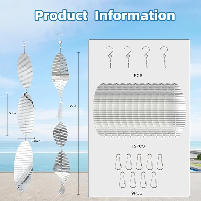 - Bird Scare Discs Set: The set includes 4 strands of bird reflectors consisting of 12 double-sided mirrored wind spinners, 4 360-degree rotating hooks, and 9 connecting hooks. you can connect them as long as you need.** Not pre-installed, assembly required according to your needs.