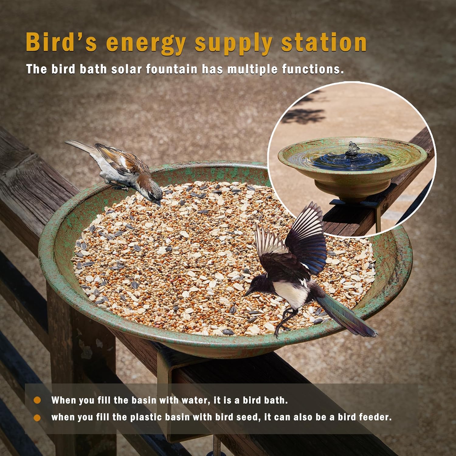 - COMBO SET: 1 Deck Railing Bird Bath Kit and 1 Solar Fountain, Solar Bird Bath Fountain is a charming decoration for your outdoor garden patio, brings beauty to your backyard, fence, patio, garden, porch, and creates a happy world for your feathered friends.