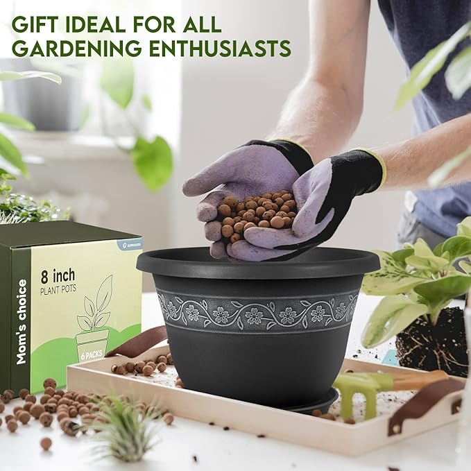 8 Inch Plant Pots with Drainage Hole - Lightweight Flower Pots for Herbs and Flowers - Home Decor Plastic Planters for Indoor Outdoor Plants- Pack of 6 (Black, 8 inch)