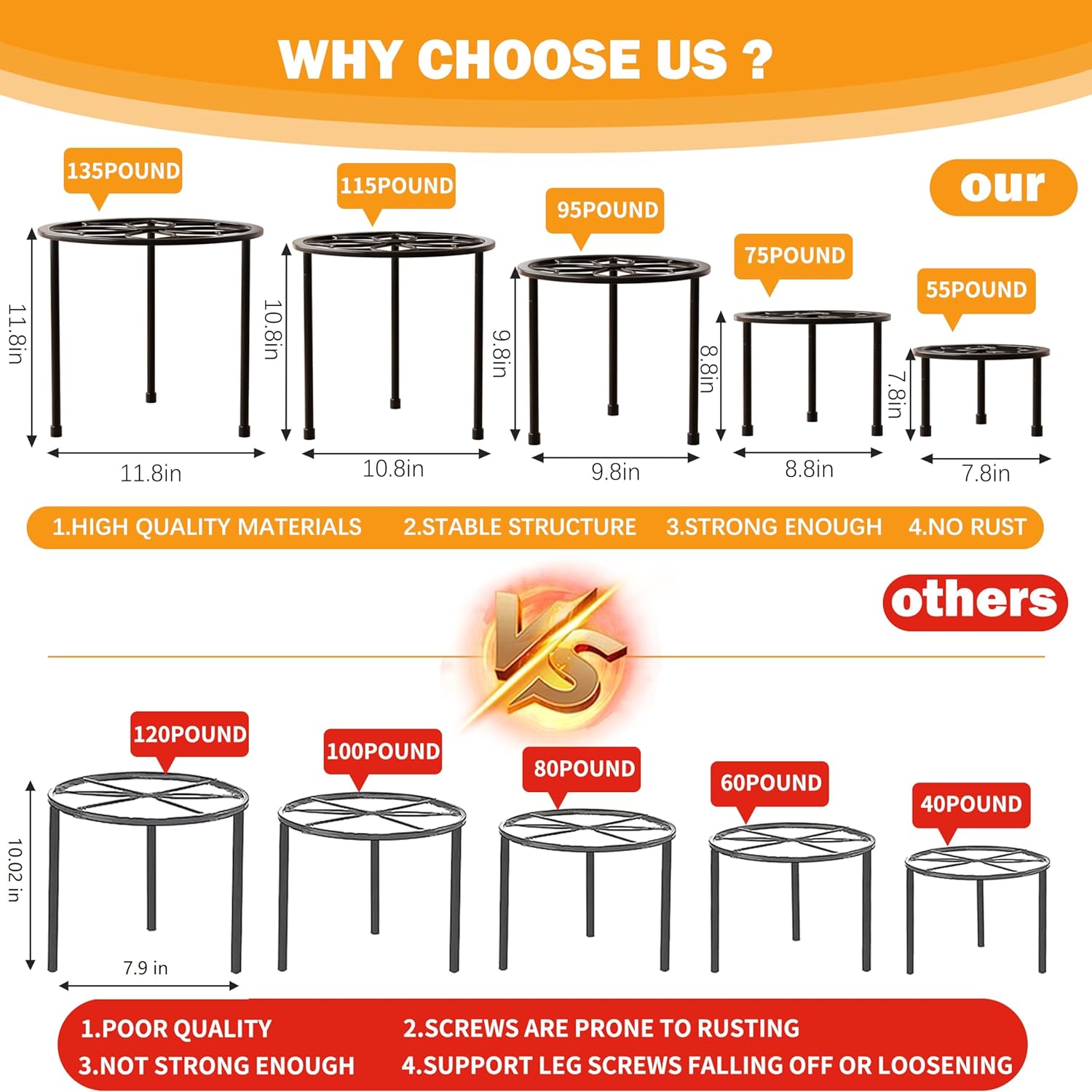 - 【Multi-Purpose Functionality】These 5 plant stand come in different heights and sizes, and all legs and plates are compatible. You can combine legs of different heights with plates of different sizes to meet your different usage needs.To ensure the optimal lighting required by different plants. It can also be applied to the usage needs of different scenarios