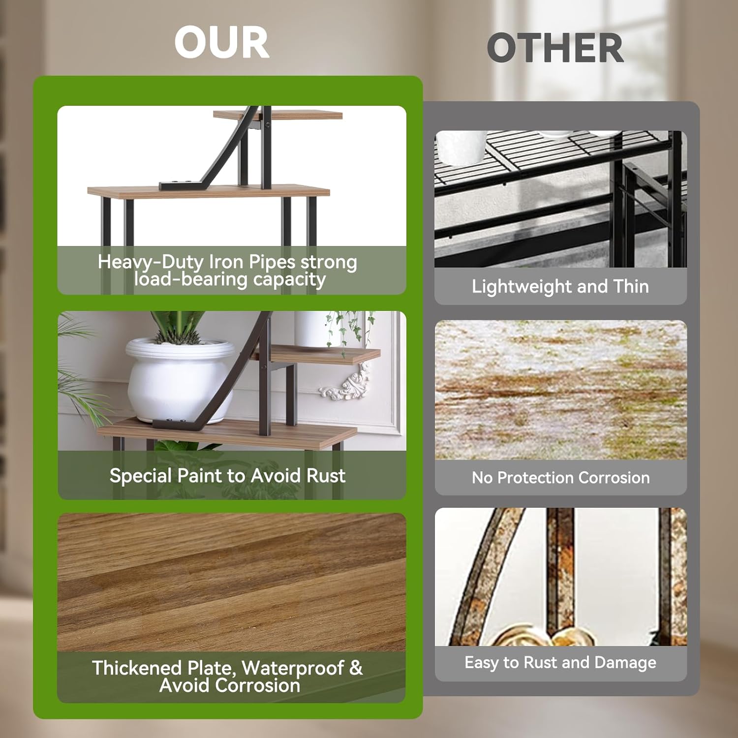 - 【More Stable & Sturdy Plant Shelf】The frame of this indoor plant stand is made of heavy-duty iron pipe that is 1.2mm thick, ensuring a robust structure and strong load-bearing capacity. The surface of the iron pipe is coated with special baking paint to avoid rust. Each layer consists of thickened(12mm) particleboard offering resistance to cracking and coated with water-resistant layer to avoid corrosion, warping and curling caused by residual water.