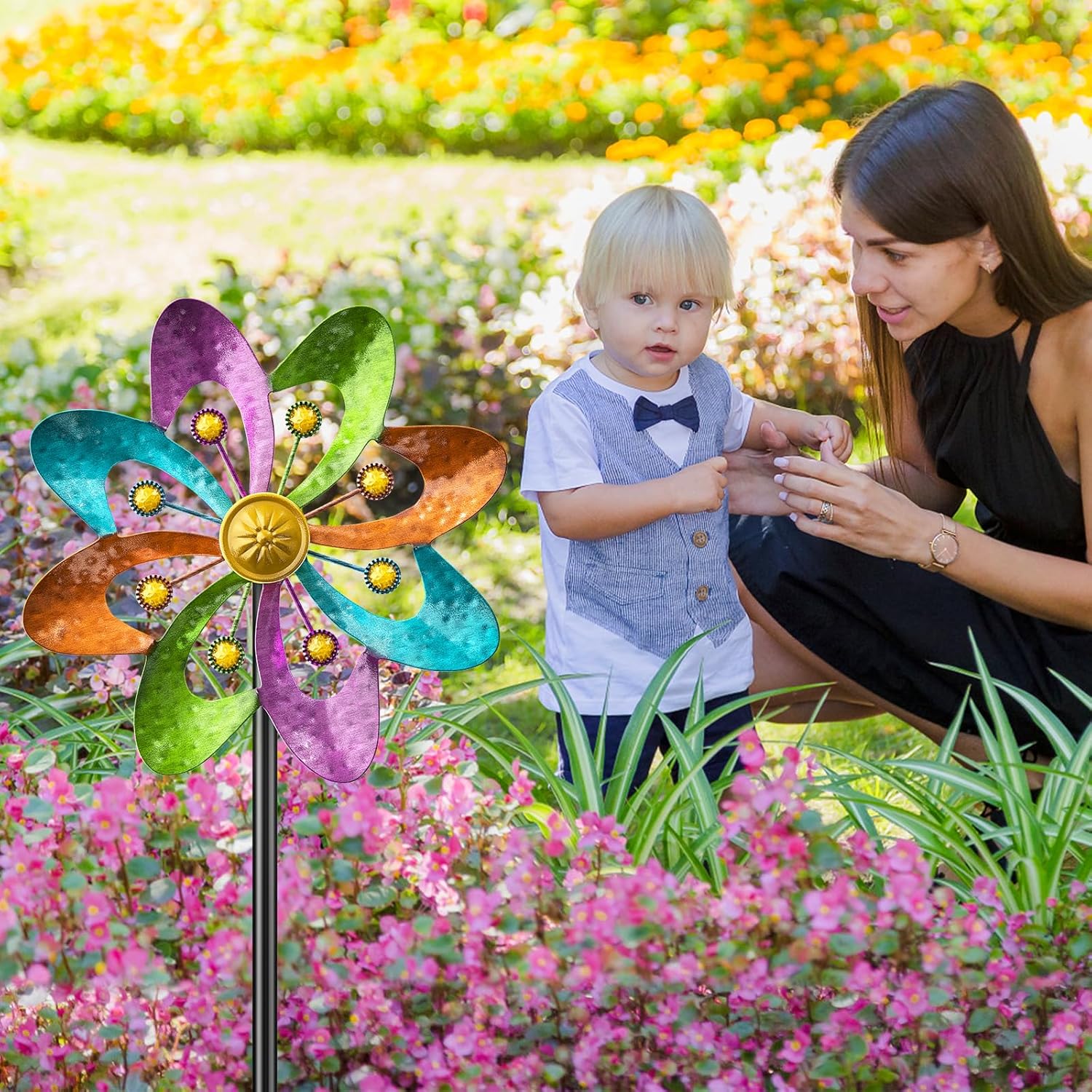 - Garden Wind Spinner Decoration:Yard wind spinners can add personality, The metal windmill rotates in the breeze, sparkling in the sun. It will bring much fun, color, and vitality to your garden, lawn, yard, pathway.