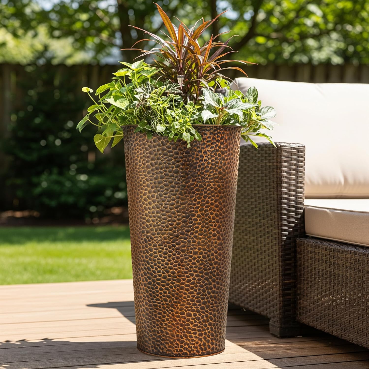 Worth Garden 2-Pack 25" H. Metal Planter with 2X Inside Pots - Hand-Hammered Texture Tall Cone Plant Pots - Large Handcrafted Black Flower Pot for Indoor Outdoor, Deck, Patio, Front Porch (Bronze)