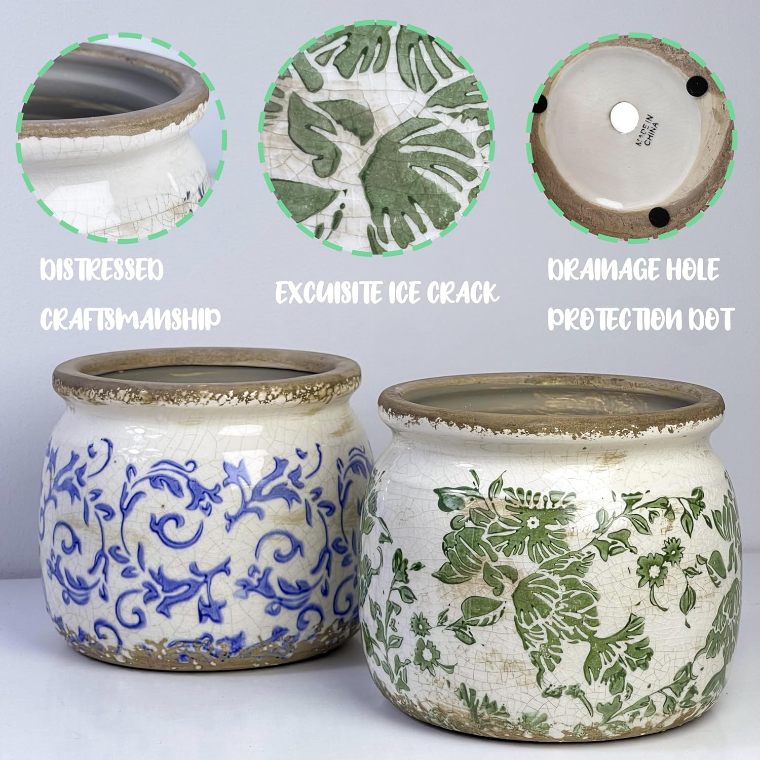 - 【Exquisite Vintage Design】 Our ceramic flower pots feature vintage ice crackle patterns and distressed craftsmanship, with exquisite floral designs that can perfectly complement any decor style. Our ceramic planters for indoor plants and outdoor plants is always eye-catching.
