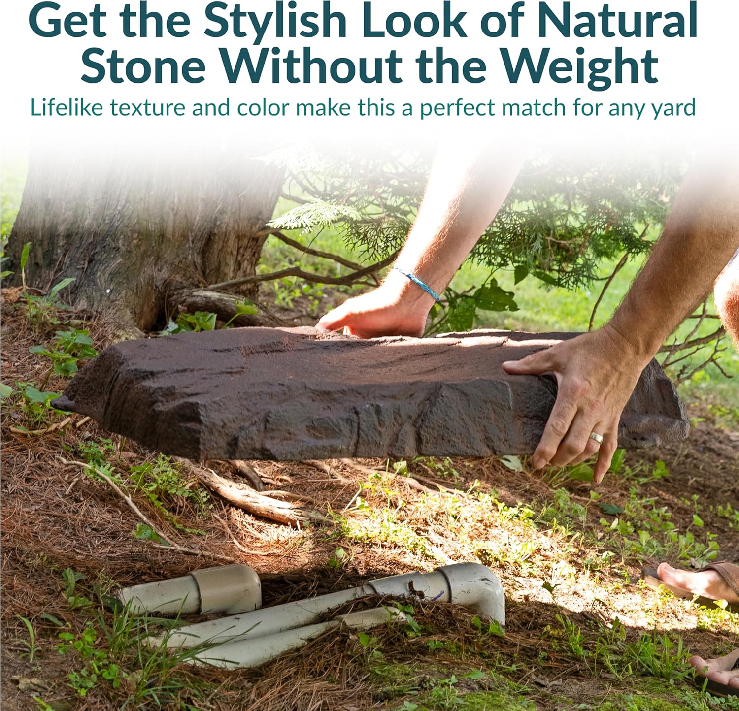 - DESIGNED TO CAMOUFLAGE: The short decorative rock cover features a durable polyresin construction with a neutral color and texture. The material withstands the elements, while the lifelike design and irregular edges blends naturally into any outdoor space. This artificial rock is for decorative purposes only; do not stand or climb on it.