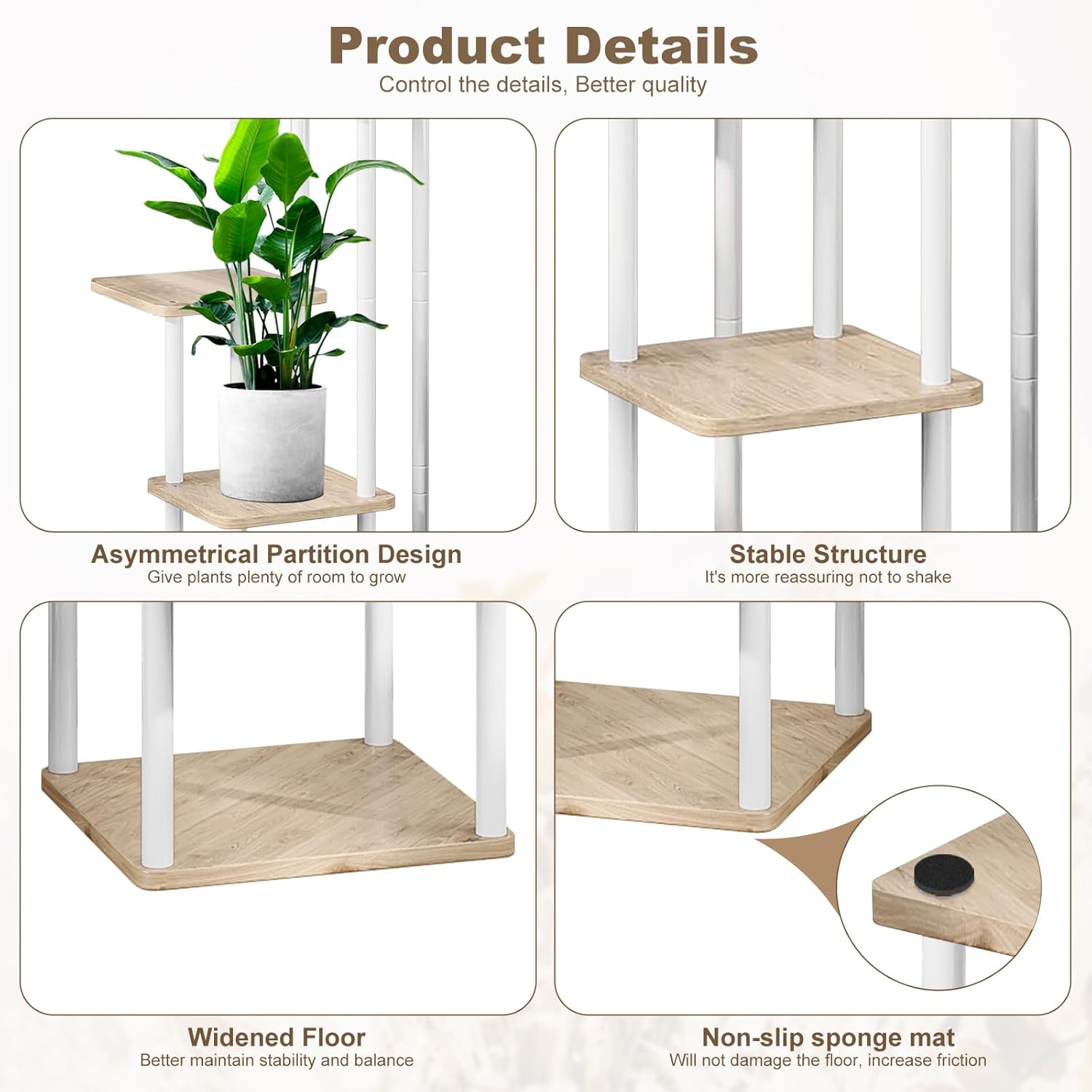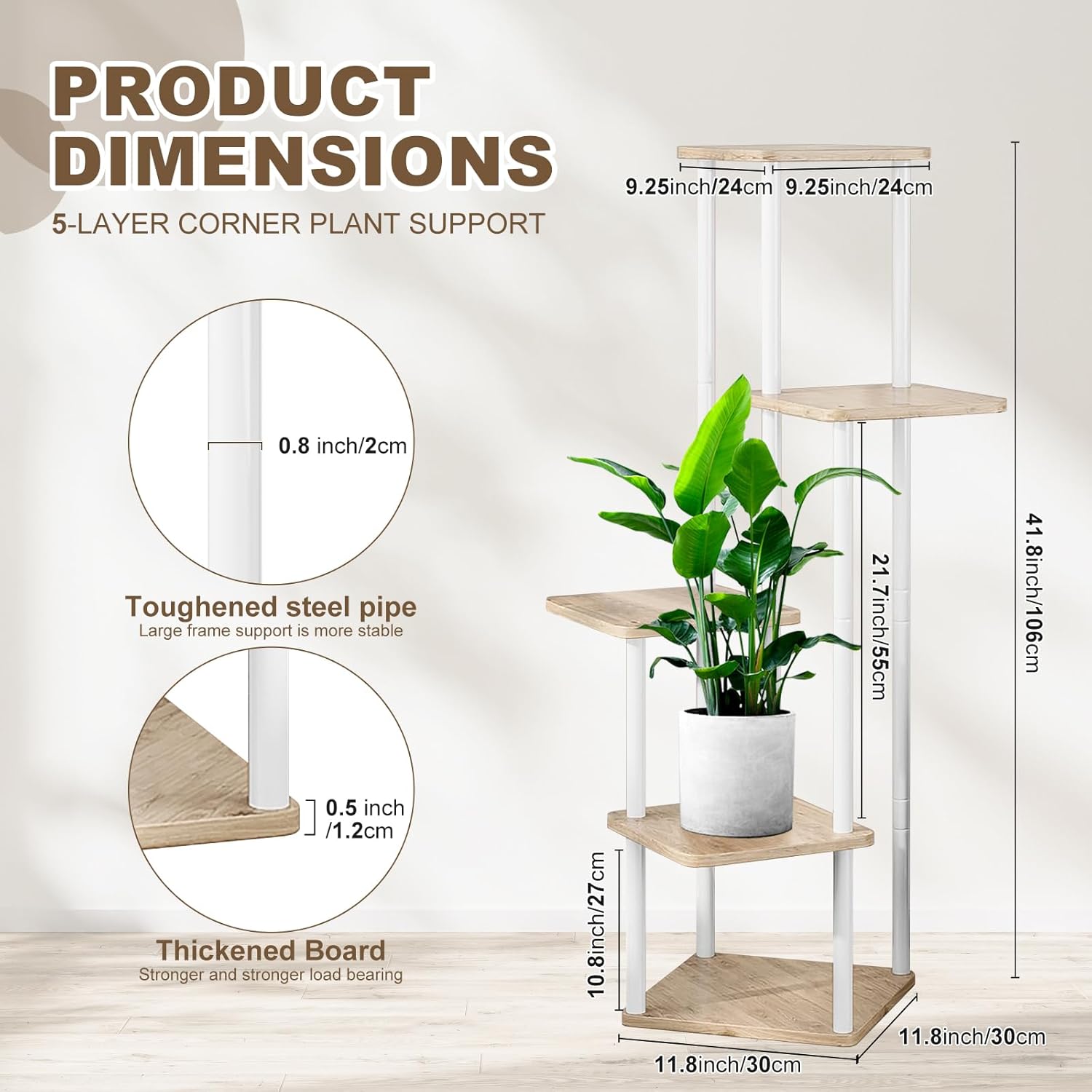 5 Tier Wood Tall Plant Stand Metal Rack Indoor, Multiple Flower Pot Holder Shelves Corner Rack, Planter Shelf Display Rack Storage Organizer for Patio Living Room Balcony Garden(White Oak)