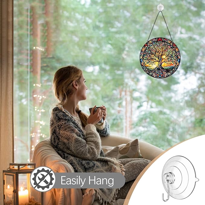 - 【Easy Installation Home Decor】The tree of life sun catcher stained glass window hanging is suitable for hanging on windows, walls, or anywhere you desire. It comes with an a metal chain and hooks for quick and easy hanging. With the metal chain, it is even more convenient to place it wherever you want, so you can effortlessly enjoy the beauty of your tree life stain glass window hanging.