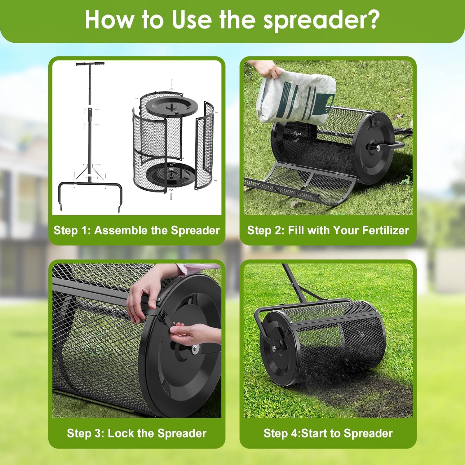 - 【Premium Material】The Seeutek compost spreader adopts all-high-quality steel structure, which is sturdy and durable. Roller measures 15.8" diameter x 24" length, and the metal mesh finish is powder-coated and heat-treated to resist rust and corrosion. Plus the ergonomic rubber T-handle is non-slip and comfortable